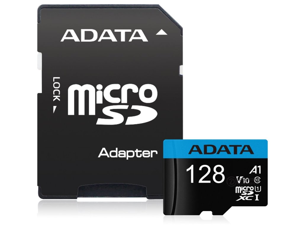 Paměťová karta formátu Micro SDXC nabízí kapacitu 128 GB. Rychlost čtení je až 85 MB/s a rychlost zápisu až 25 MB/s. Součástí balení je SD adaptér.