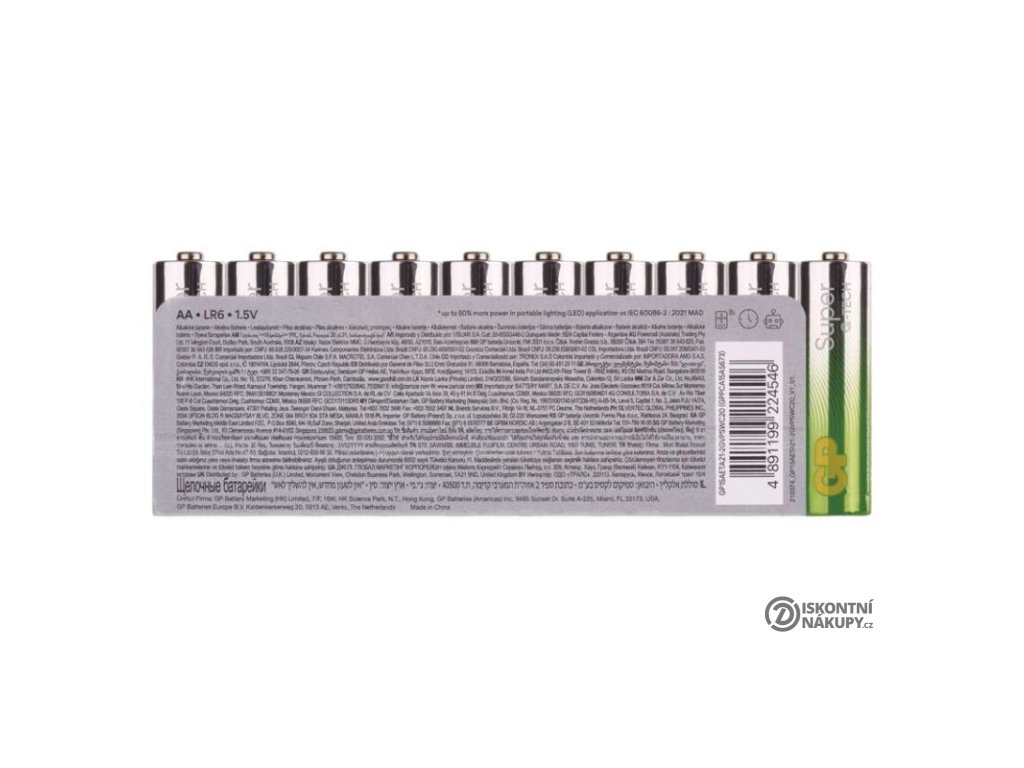 chemické složení: alkalické|hmotnost: 23 g|kapacita: neuvádí se|kategorie/řada: Super Alkaline|max. skladovatelnost: 10 let|možnost nabíjení: ne|napětí: 1,5 V|počet nabíjecích cyklů: nenabíjecí|prodejní obal: 20 ks, fólie|provozní teplota: -18 °C až +50 °C|rozměr: 14,5 × 50,5 mm|typ: LR6 (tužka, AA)|velikost baterie: AA|značka: GPDoplňkové parametry