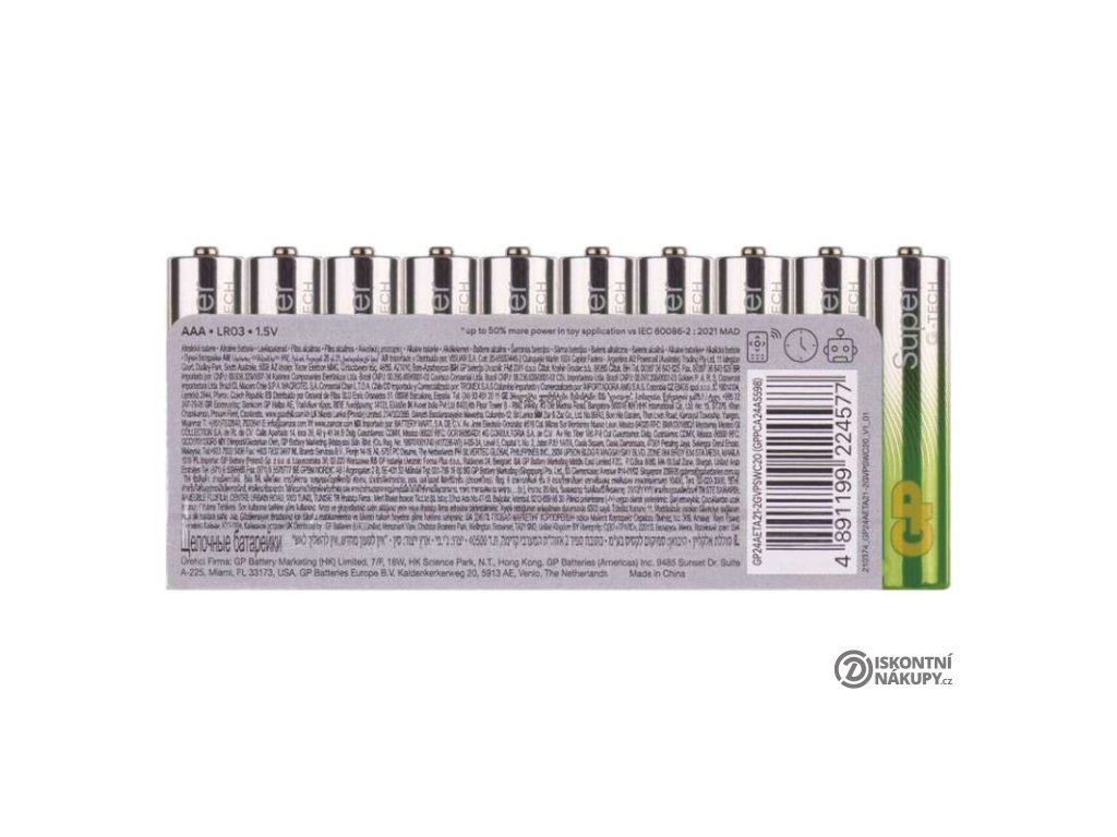 chemické složení: alkalické|hmotnost: 11,5 g|kapacita: neuvádí se|kategorie/řada: Super Alkaline|max. skladovatelnost: 10 let|možnost nabíjení: ne|napětí: 1,5 V|počet nabíjecích cyklů: nenabíjecí|prodejní obal: 20 ks, fólie|provozní teplota: -18 °C až +50 °C|rozměr: 10,5 × 44,5 mm|typ: LR03 (mikrotužka, AAA)|velikost baterie: AAA|značka: GPDoplňkové parametry
