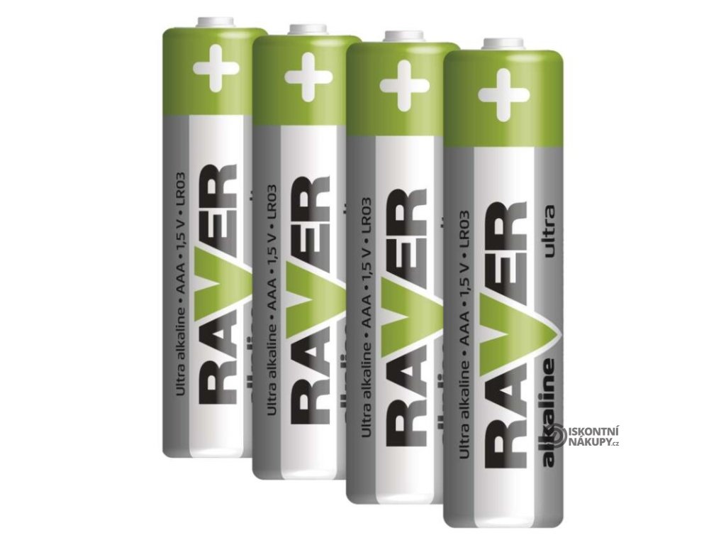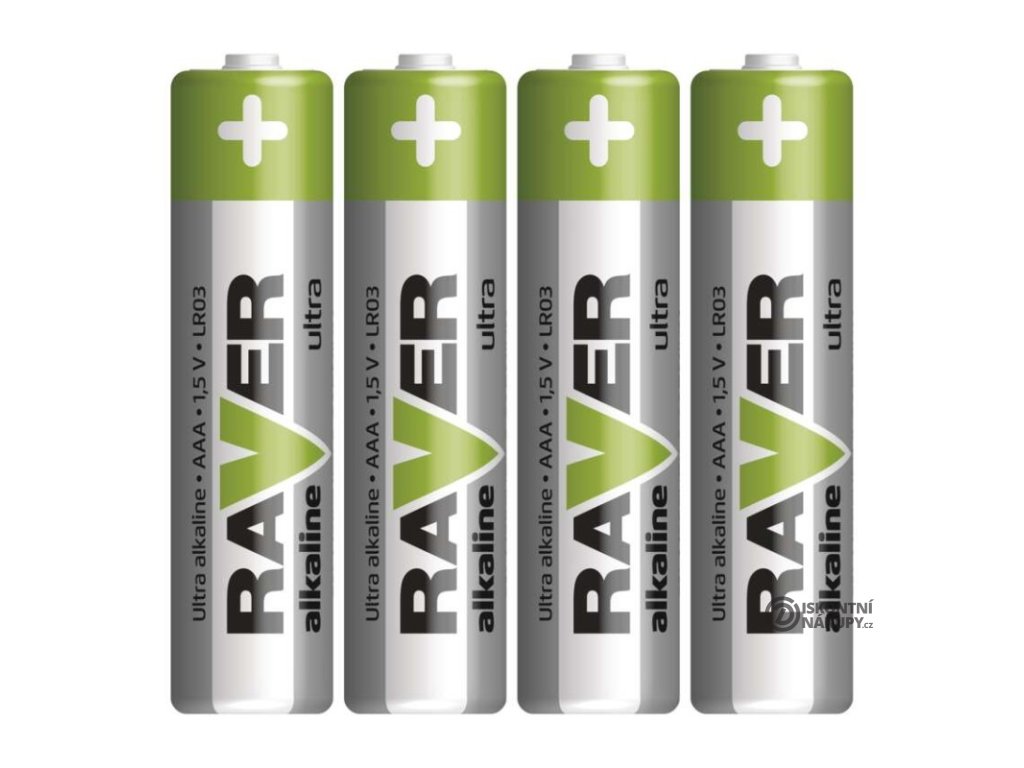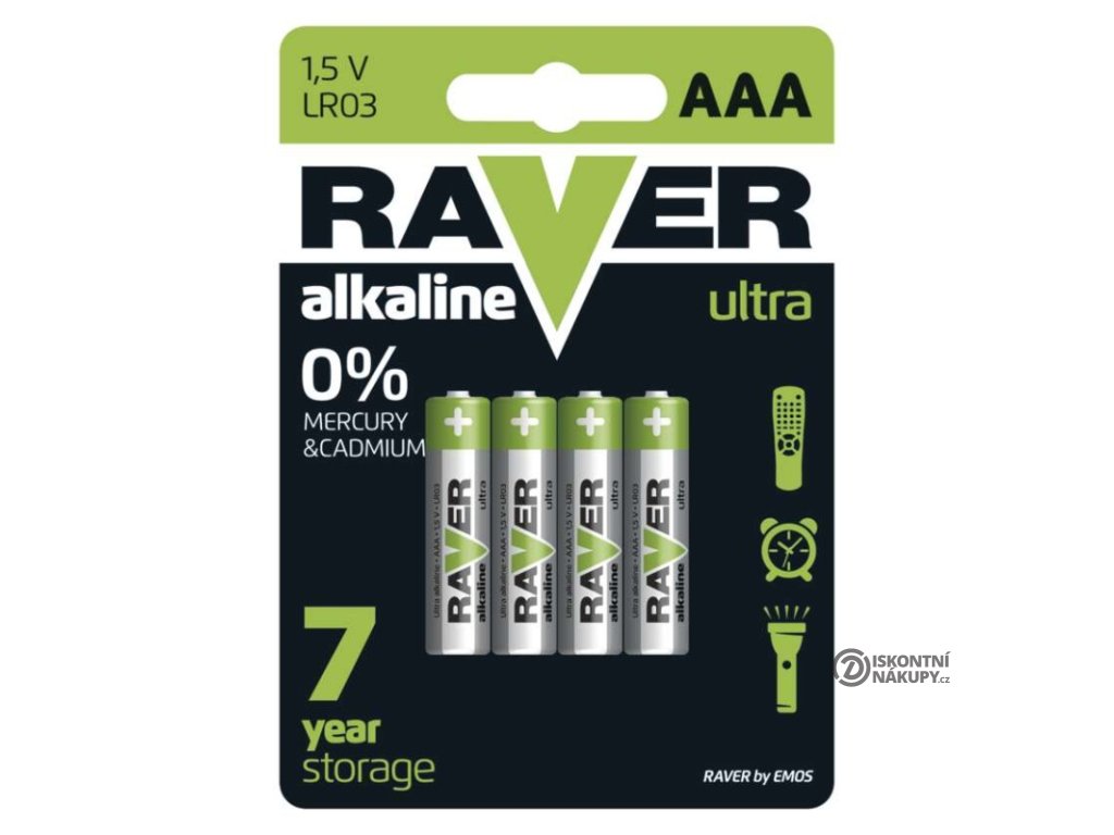 chemické složení: alkalické|hmotnost: 11,5 g|kapacita: neuvádí se|kategorie/řada: Ultra Alkaline|max. skladovatelnost: 7 let|možnost nabíjení: ne|napětí: 1,5 V|počet nabíjecích cyklů: nenabíjecí|prodejní obal: 4 ks, blistr|provozní teplota: -20 °C až +60 °C|rozměr: 10,5 × 44,5 mm|typ: LR03 (mikrotužka, AAA)|velikost baterie: AAA|značka: RaverPopis produktu