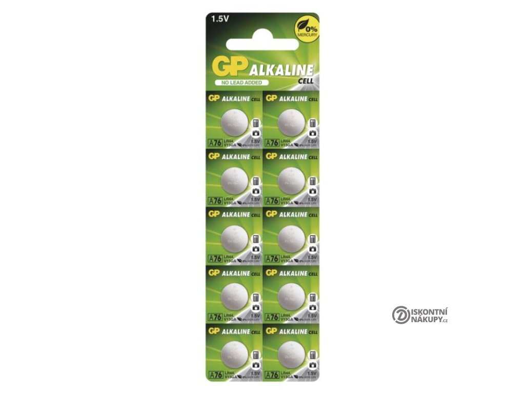 chemické složení: alkalické|hmotnost: 1,7 g|kapacita: 110 mAh (při zátěži 1,6 kOhm)|kategorie/řada: Alkaline cell|max. skladovatelnost: 3 roky|možnost nabíjení: ne|napětí: 1,5 V|počet nabíjecích cyklů: nenabíjecí|prodejní obal: 10 ks, blistr|provozní teplota: 0 °C až +45 °C|rozměr: 11,6 × 5,4 mm|typ: GP A76F (AG13, LR44, LR1154, V13GA, PX76A)|velikost baterie: neuvádí se|značka: GPDoplňkové parametry