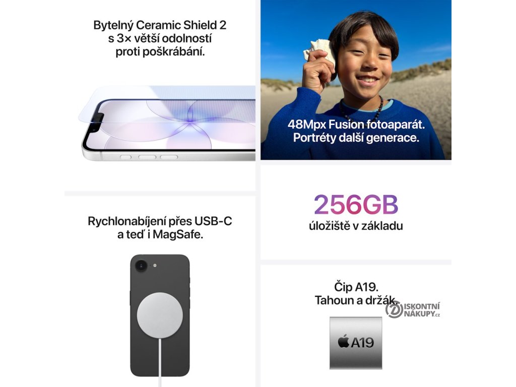 Smartphone podporuje bezdrátové nabíjení MagSafe výkonem až 15 W (oproti 7,5 W u iPhone 16e) a rychlé drátové nabíjení přes USB-C s možností dobití na 50 % za 30 minut. Hliníkový rámeček, skleněná zadní strana a certifikace IP68 zajišťují odolnost proti vodě do hloubky 6 metrů po dobu až 30 minut. V základu nabízí 256GB úložiště – dvakrát více než iPhone 16e.