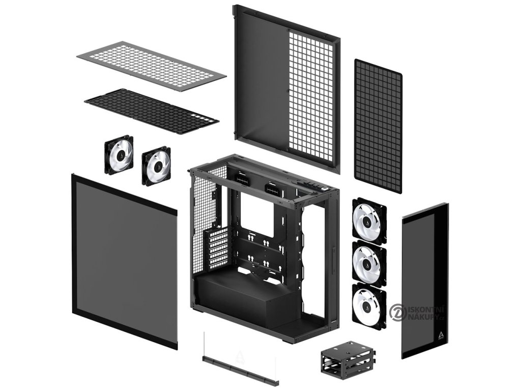 - Předinstalované A-RGB ventilátory 2× P12 Pro (zadní) a 3× P14 Pro Reverse (boční)