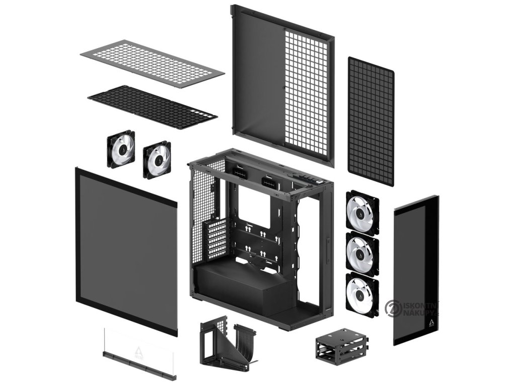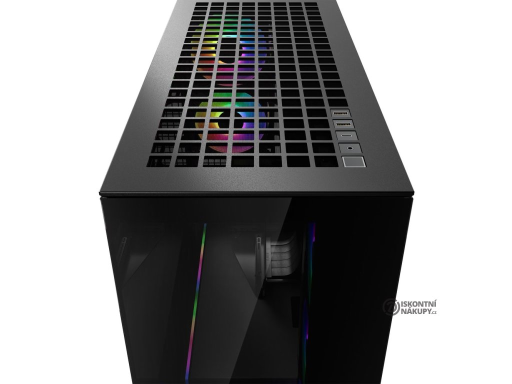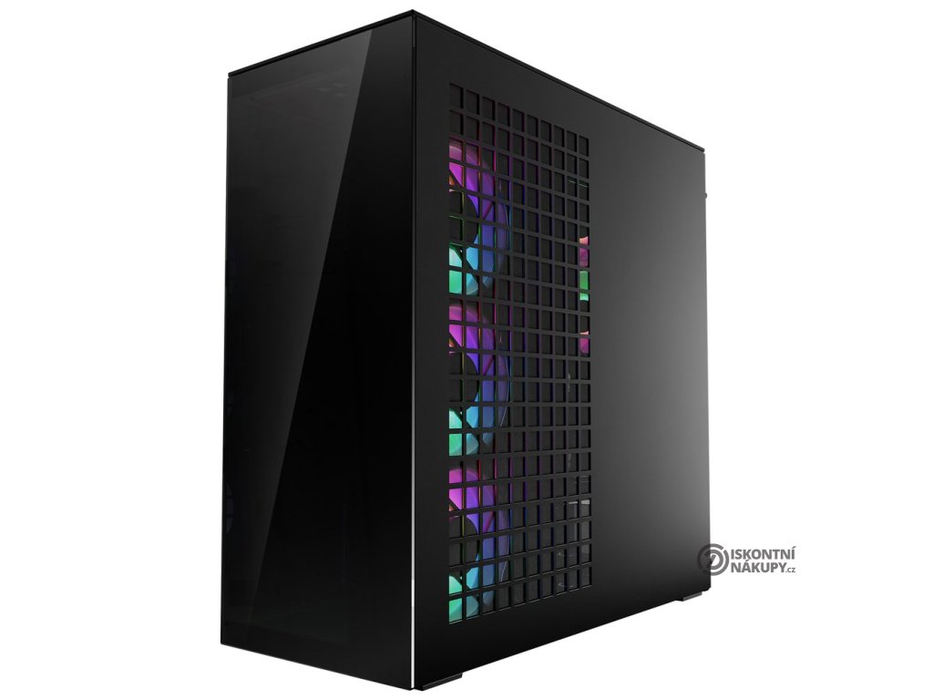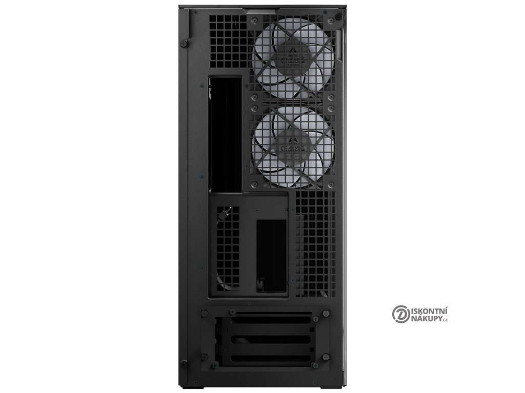 Skříň je vybavena celkem 5 A-RGB ventilátory – dvěma 120mm vzadu a třemi 140mm na boku, které zajišťují optimální chlazení i při vysokém zatížení. Prostorný interiér pojme grafické karty až 482 mm, CPU chladiče do výšky 171 mm a zdroje až 318 mm.