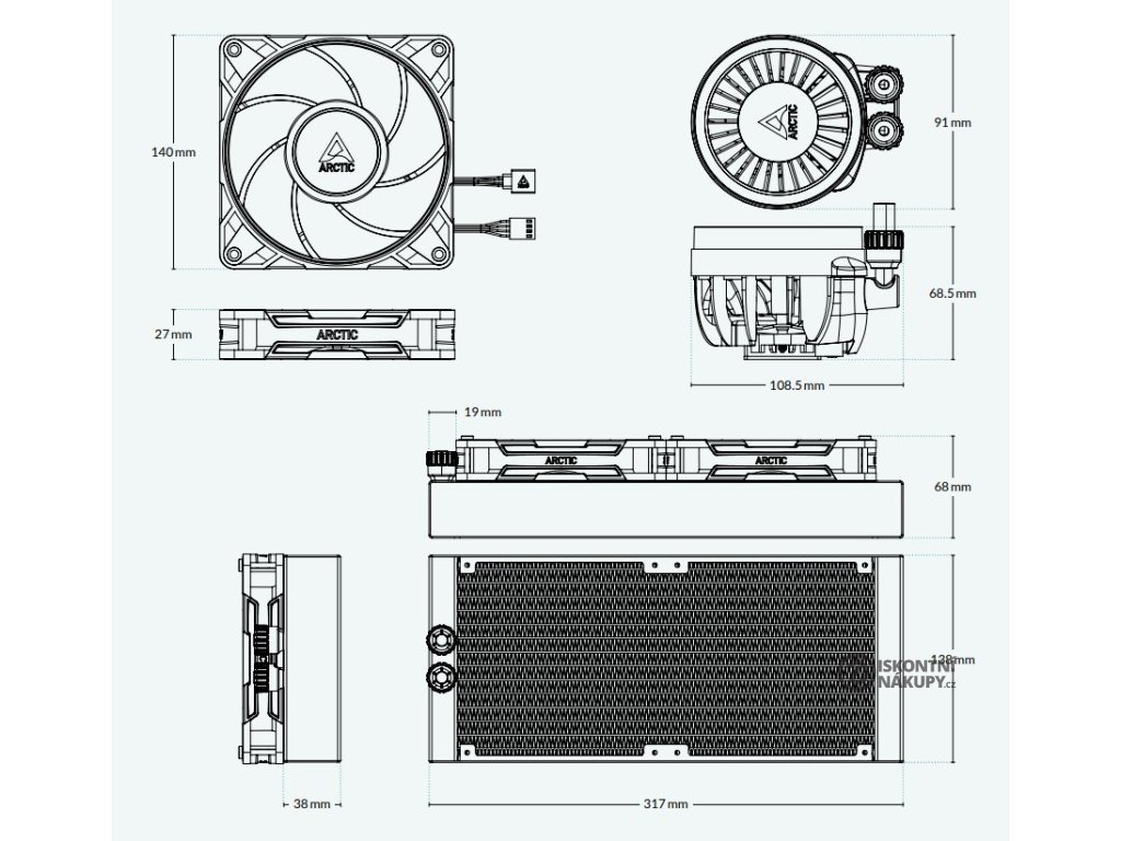 - Výkonný 280mm hliníkový radiátor s rozměry 317 × 138 × 38 mm pro efektivní odvod tepla