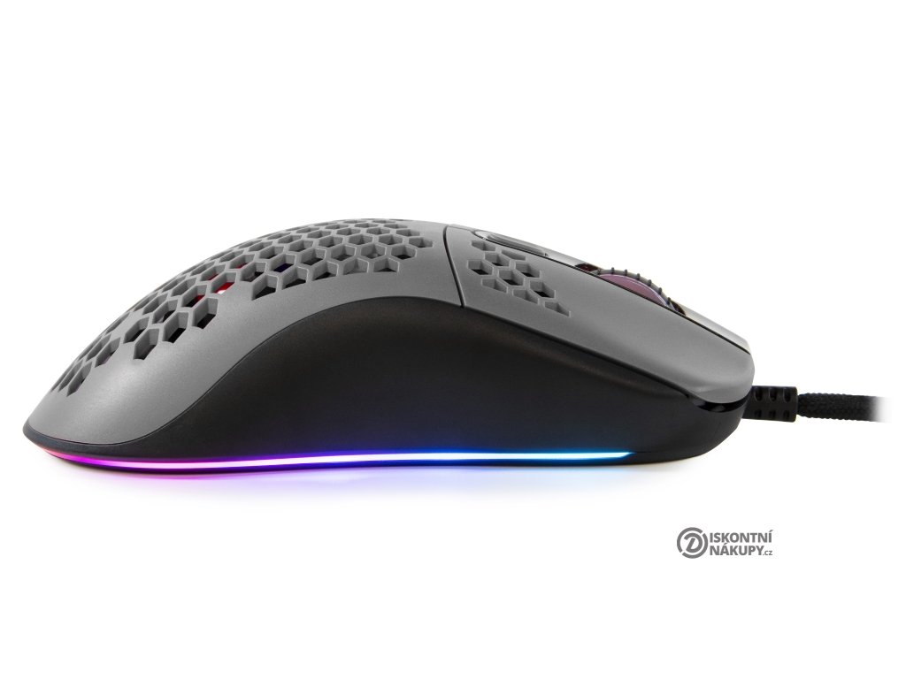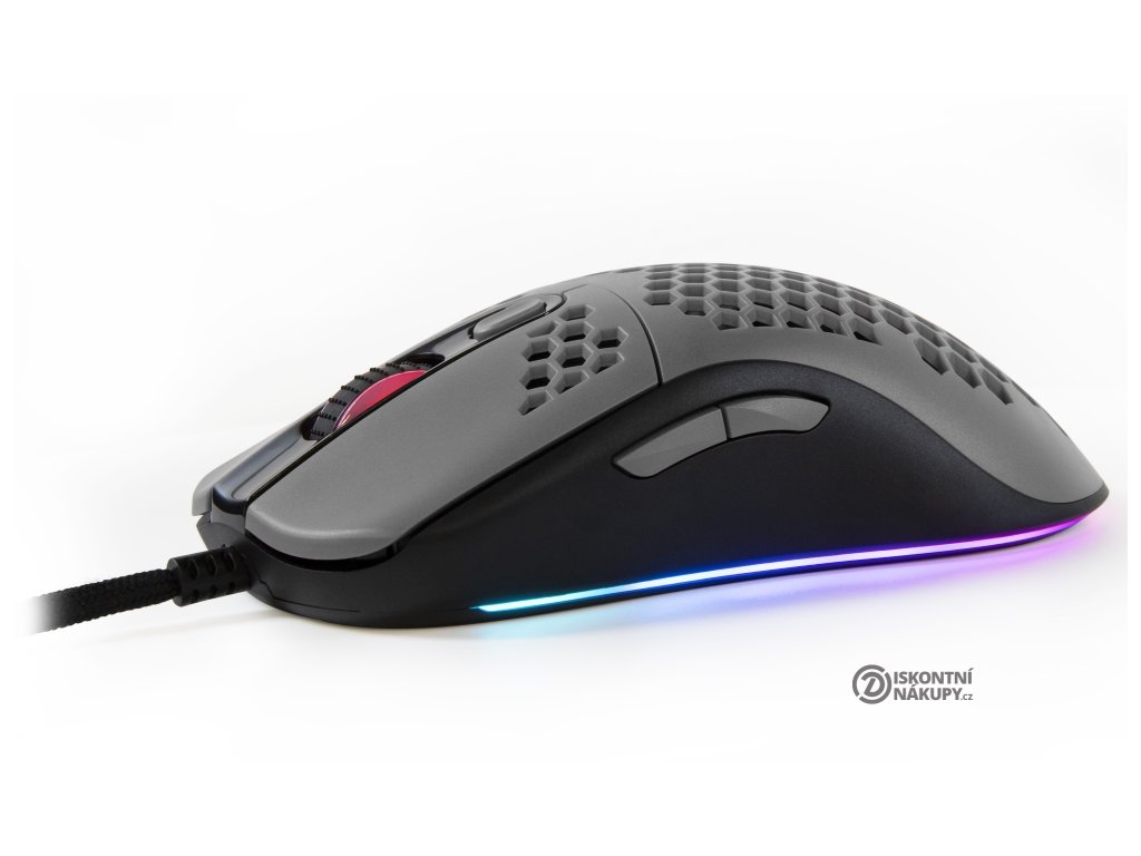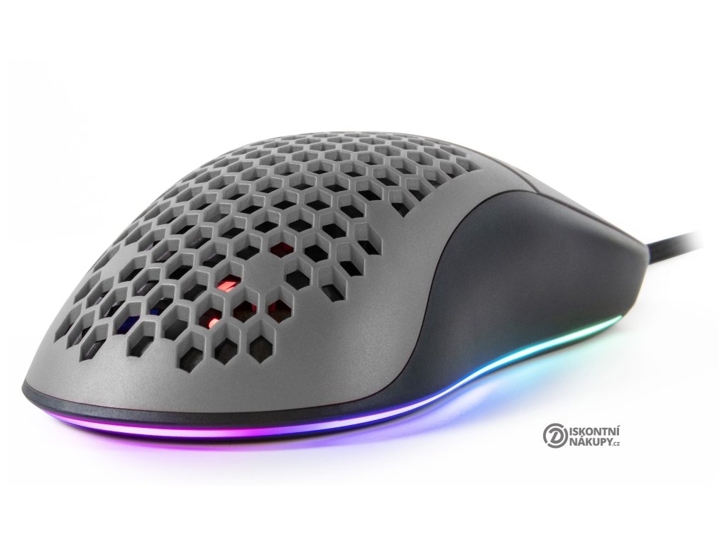 Arozzi Favo Ultra LightUltralehká herní myš disponující 7 programovatelnými tlačítky a vysoce přesným optickým senzorem Pixart 3389 s rozlišením až 16000 DPI. Kryt v designu plástve snižuje celkovou hmotnost, zlepšuje odvod tepla, a tím zajistí i pevnější uchopení myši. Herní design poté doplňuje nastavitelné RGB podsvícení. Kvalitní spínače Omron vydrží více než 20 milionů kliknutí. Připojení je realizováno skrze opletený USB kabel.