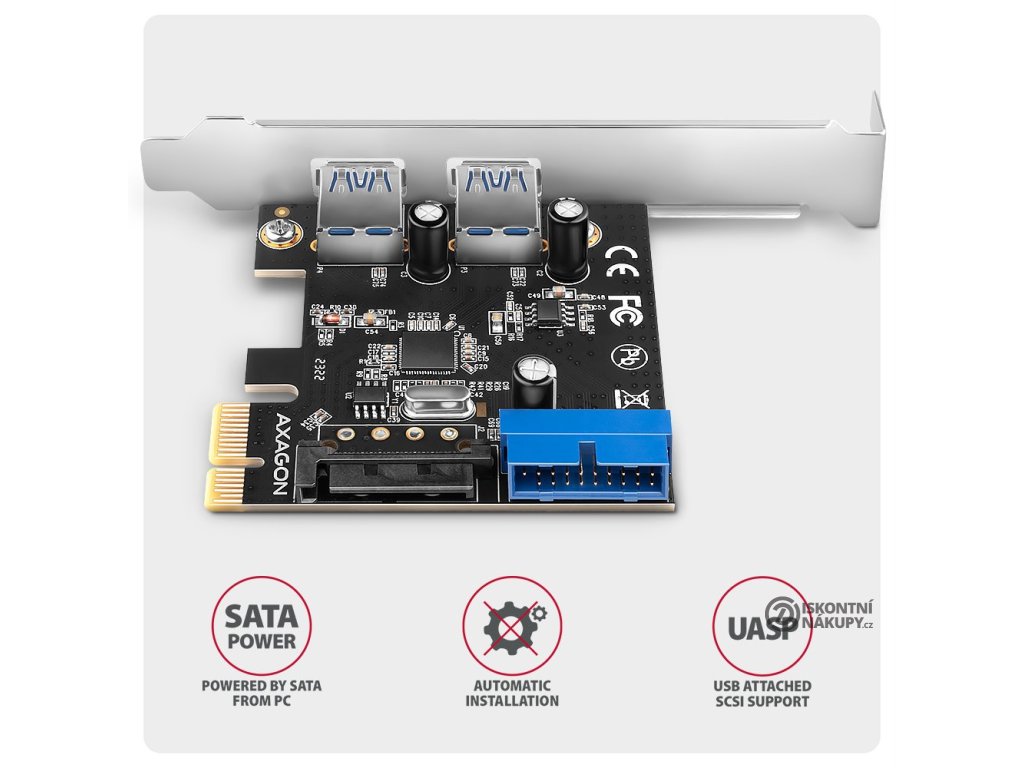 AXAGON PCEU-232RSPřidáním tohoto řadiče rozšíříte svůj počítač o čtyři porty USB 3.0, které nabízí datové přenosy rychlostí až 5 Gb/s. Dva porty jsou vyvedeny na záslepku a dva porty jsou integrovány na desce karty. Umožňují tak připojení interní USB čtečky nebo zapojení předních USB portů PC skříně. Napájení je zajištěno z počítačového zdroje přes napájecí SATA konektor. Řadič je osazen čipsetem Renesas, vyznačujícím se ověřenou bezproblémovou kompatibilitou a podporou UASP.