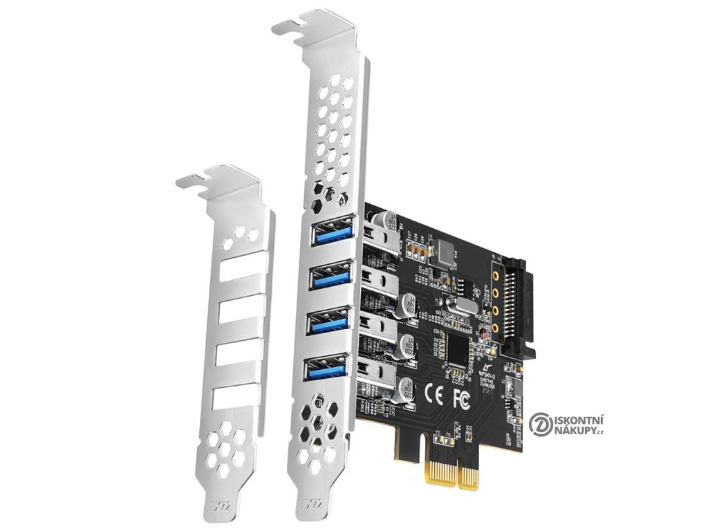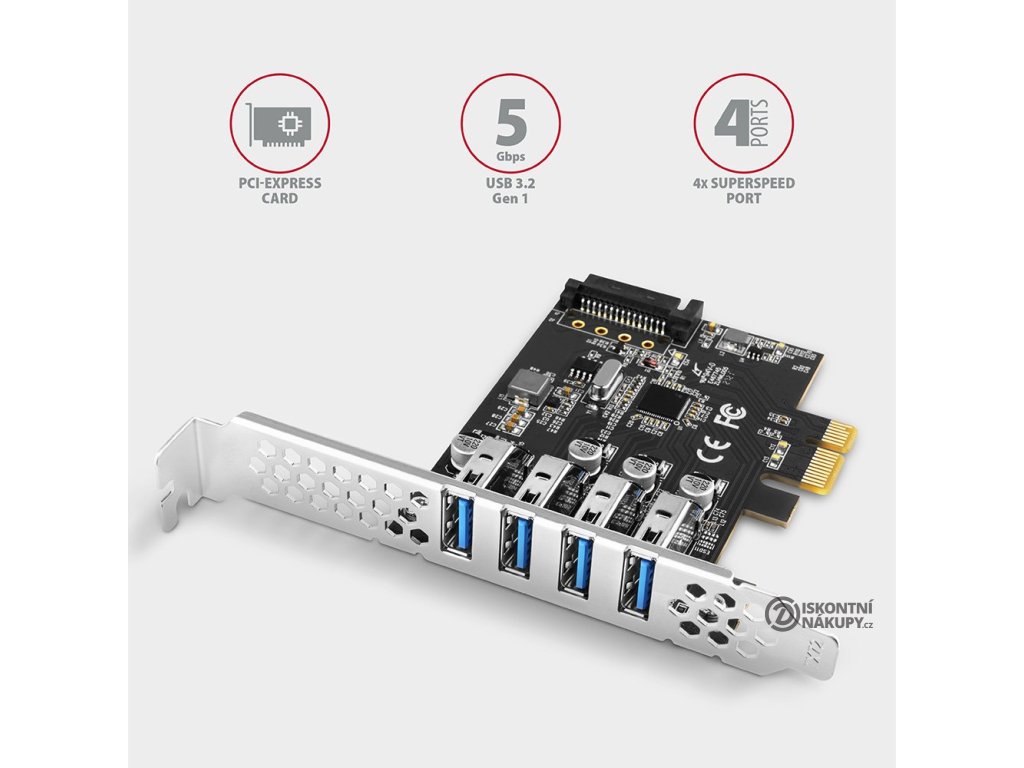 AXAGON PCEU-43RSPřidáním tohoto řadiče rozšíříte svůj počítač o čtyři USB 3.2 Gen1 porty. Napájení je zajištěno přes napájecí SATA konektor.