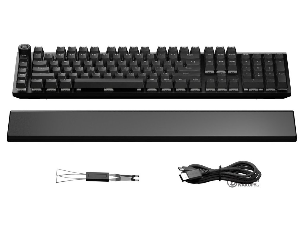 Obsahuje 3D hliníkové kolečko pro ovládání médií, pět programovatelných makro kláves a boční i horní ARGB LED pásky. Ergonomii zajišťuje magnetická opěrka dlaní a nastavitelné nožky ve třech úhlech.