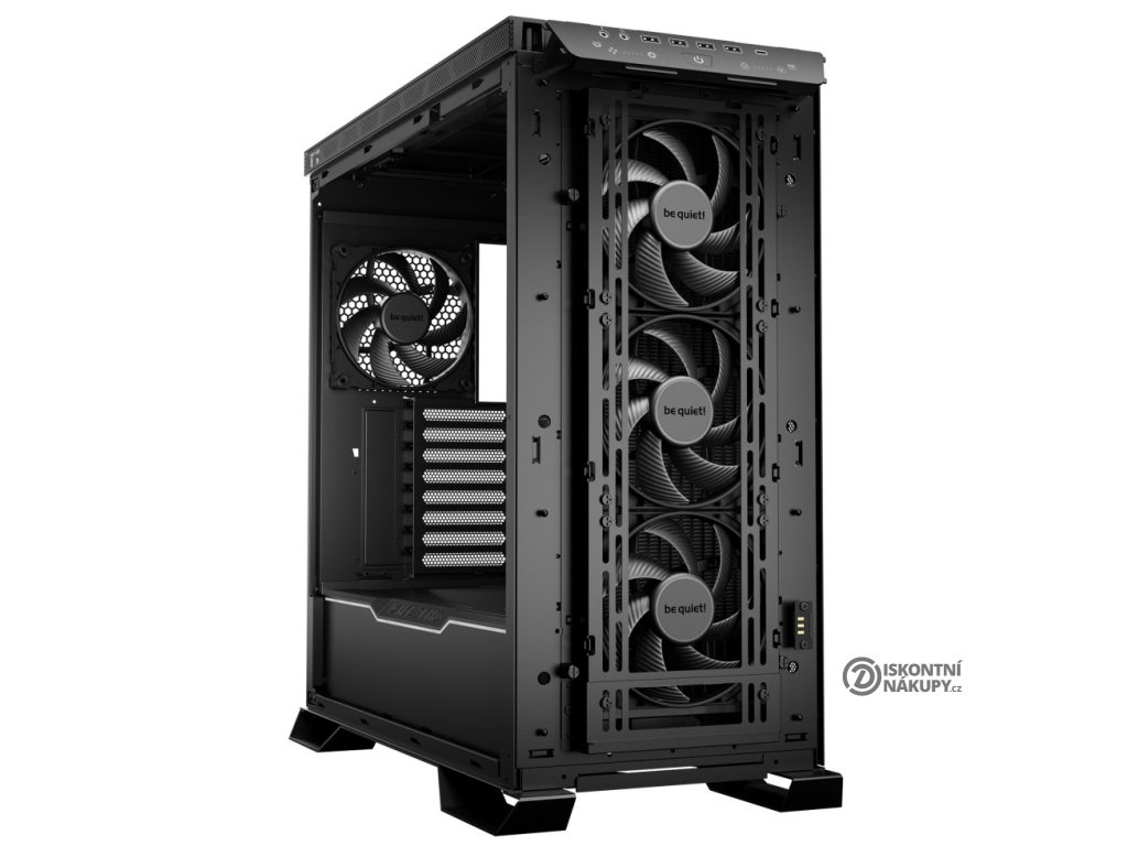 Be quiet! DARK BASE PRO 901 WindowKvalitní počítačová skříň s průhlednou bočnicí formátu Middle Tower nabízí šest 2,5" pozic pro SSD disky a dvě 3,5" pozice pro pevné disky. Předinstalovány jsou tři 140 mm ventilátory, které lze optimalizovat jak pro tichý chod, tak pro výkon bez kompromisu pomocí dotykových tlačítek na horním panelu. Zde se také nachází čtyři porty USB 3.0, jeden port USB-C, sluchátkový výstup a audio vstup pro mikrofon. Herní design ještě doplňuje elegantní ARGB osvětlení. Ve skříni je dostatek prostoru pro chladič CPU do výšky až 190 mm a grafickou kartu o délce až 370 mm. Důmyslné řešení umožňuje pohodlné umístění až 420 mm dlouhého výměníku vodního chlazení na přední straně. Potěší také přítomnost prachových filtrů. Skříň je dodávána bez zdroje.