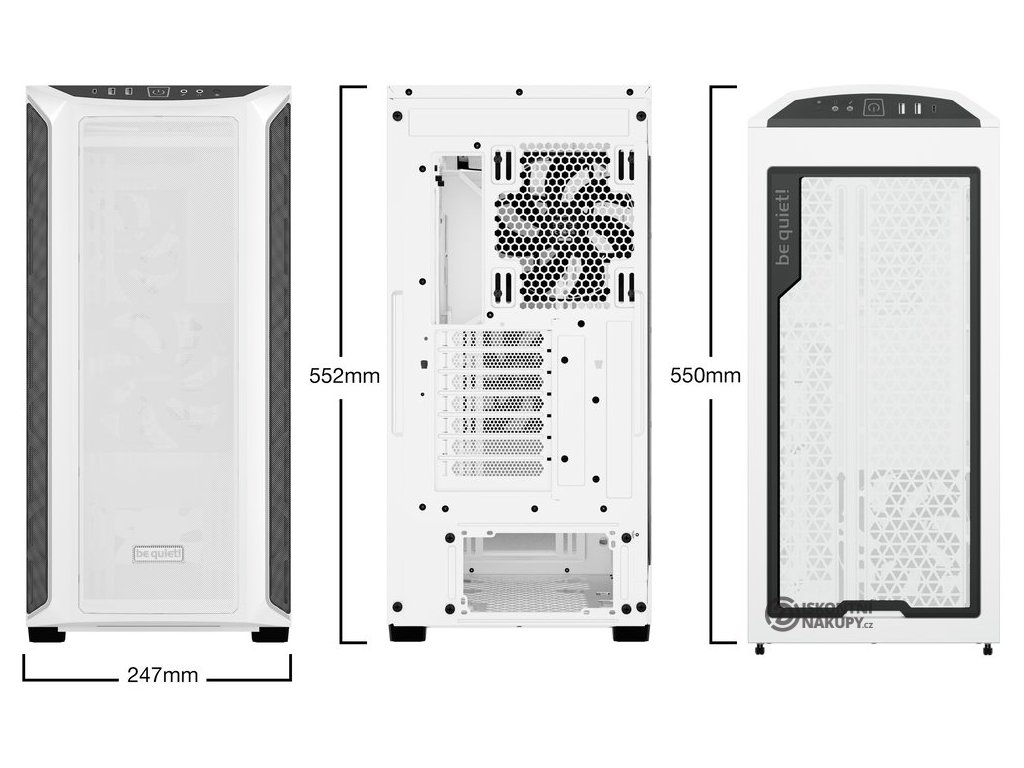 Be quiet! SHADOW BASE 800DXSkříň v provedení Middle Tower s průhlednou bočnicí a předním ARGB podsvícením nabízí dvě 3,5" pozice pro pevné disky a čtyři 2,5" pozice pro SSD disky. Na horním panelu naleznete dva porty USB 3.0, jeden port USB-C a dále také konektory pro sluchátka a mikrofon. Skříň je osazena třemi ventilátory o velikosti 140 mm, a to v přední, vrchní a zadní části, přesně tak, aby zaručily nejlepší průchod vzduchu. Ve skříni je dostatek prostoru pro chladič CPU do výšky až 180 mm a grafickou kartu o délce až 430 mm. Důmyslné řešení umožňuje pohodlné umístění až 420 mm dlouhého výměníku vodního chlazení na přední a vrchní straně. Potěší taktéž integrovaná lišta pro lepší organizaci kabelů a dvojice prachových filtrů. Skříň je dodávána bez zdroje.