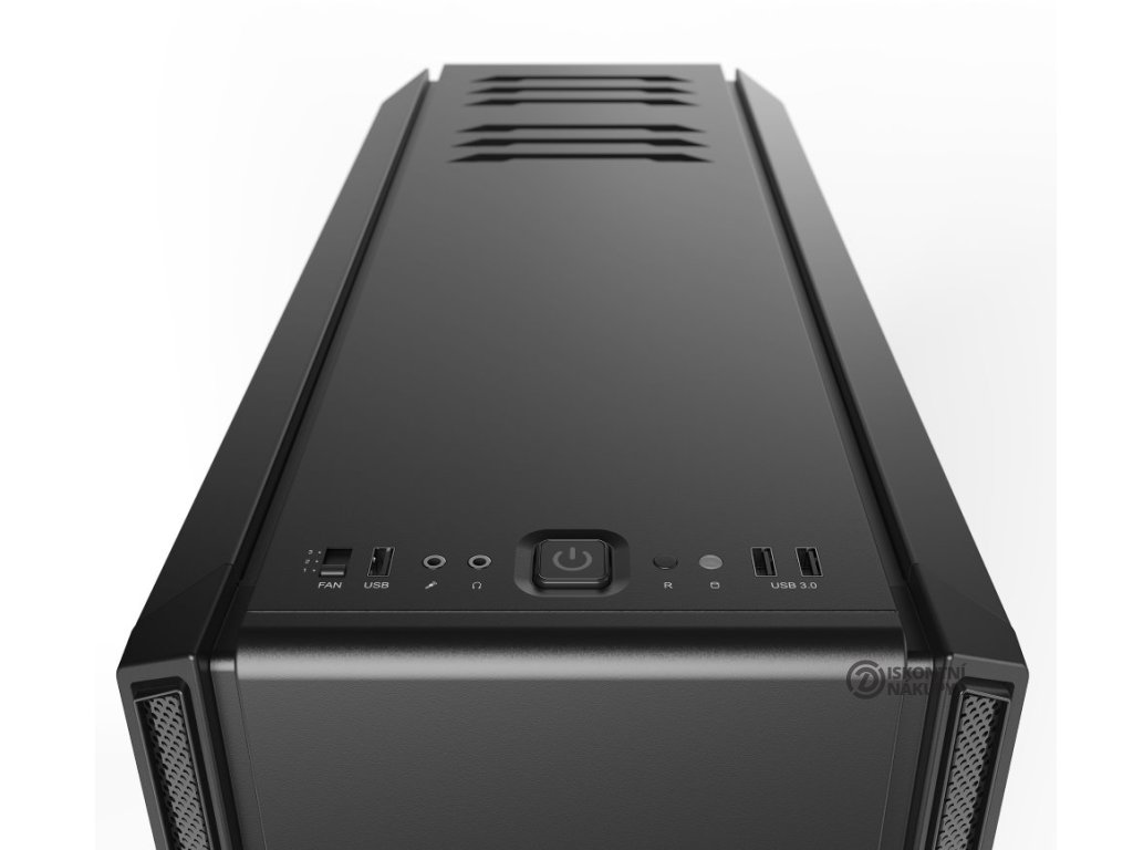 Konektory na horním panelu: 2x USB 3.0, 1x USB 2.0, 1x výstup pro sluchátka, 1x vstup mikrofonu, regulátor otáček ventilátorů