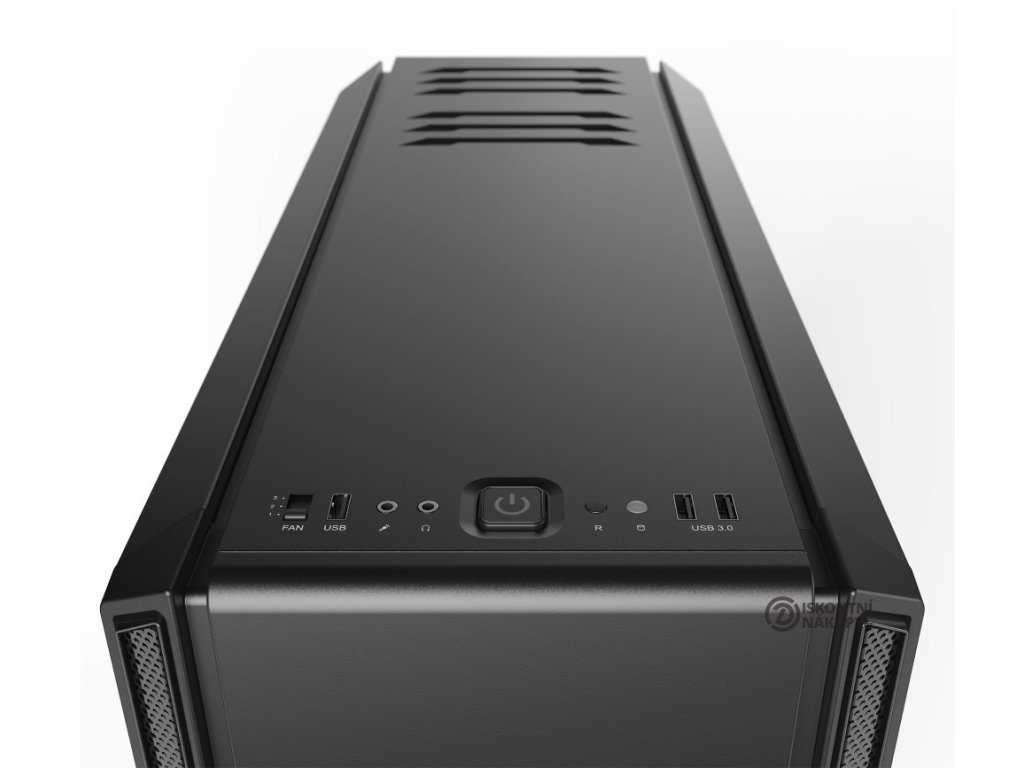 Konektory na horním panelu: 2 x USB 3.0, 1 x USB 2.0, 1 x výstup pro sluchátka, 1 x vstup mikrofonu, regulátor otáček ventilátorů