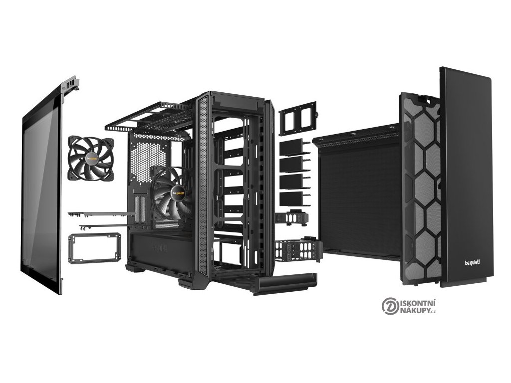 Be quiet! SILENT BASE 601 WindowKvalitní počítačová skříň formátu Middle Tower, která na první pohled zaujme průhlednou bočnicí. Vybavena je dvěma prakticky neslyšitelnými ventilátory, které je možné díky 3stupňovému regulátoru přepínat mezi režimy ticha nebo výkonu. Potěší také možnost rozšíření o dalších šest ventilátorů. Na horní straně se nachází dva USB 3.0 porty, jeden USB 2.0 port, sluchátkový výstup a vstup pro mikrofon. Podporuje montáž základních desek E-ATX, ATX, M-ATX a MINI-ITX. Pro disky pak slouží tři 3,5" pozice nebo až šest 2,5" pozic. Skříň je dodávána bez zdroje.
