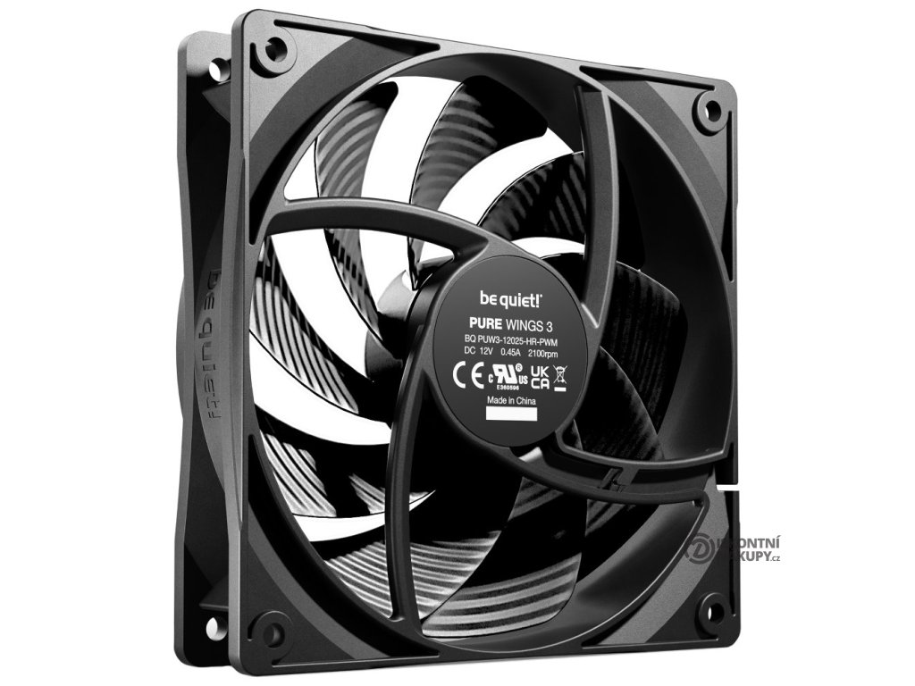 Be quiet! Pure Wings 3 120 mm PWM high-speedExtra tichý ventilátor s PWM regulací otáček. Lopatky s optimalizovaným povrchem zajišťují téměř neslyšitelný chod a perfektní průtok vzduchu.
