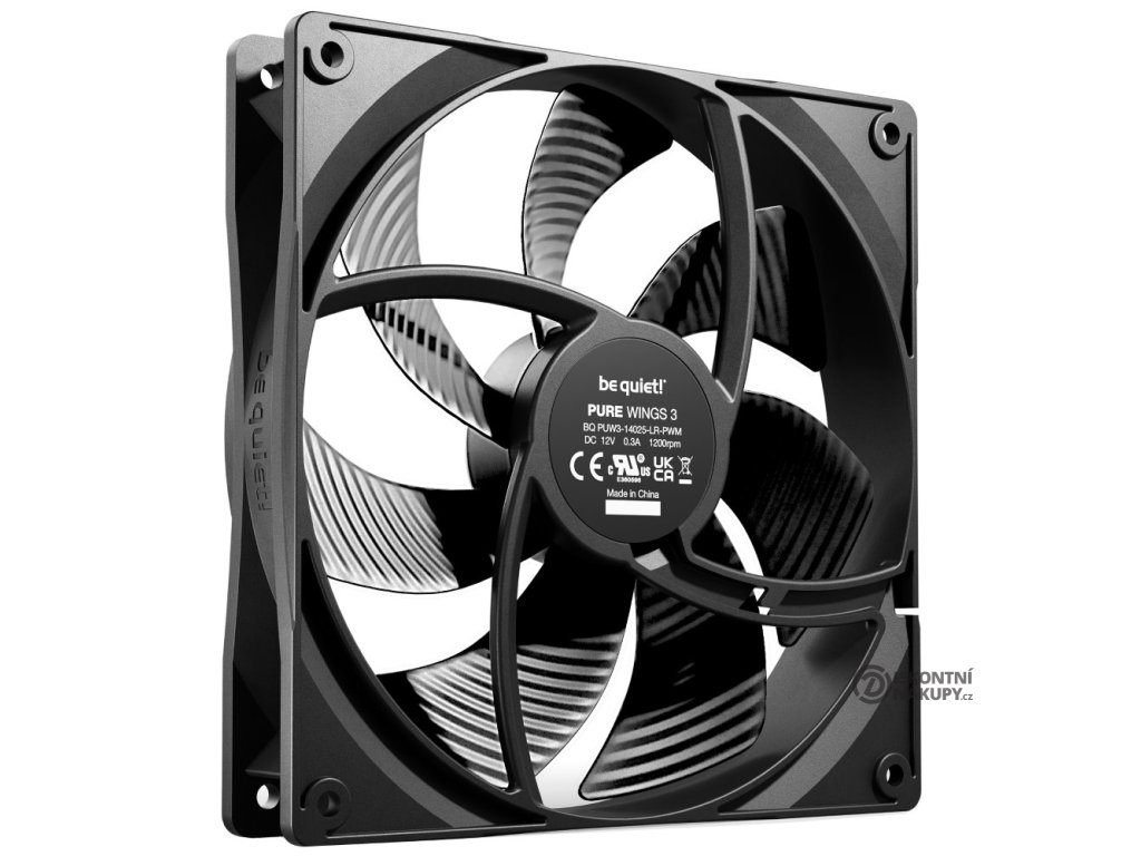Be quiet! Pure Wings 3 140 mm PWMExtra tichý ventilátor s PWM regulací otáček. Lopatky s optimalizovaným povrchem zajišťují téměř neslyšitelný chod a perfektní průtok vzduchu.