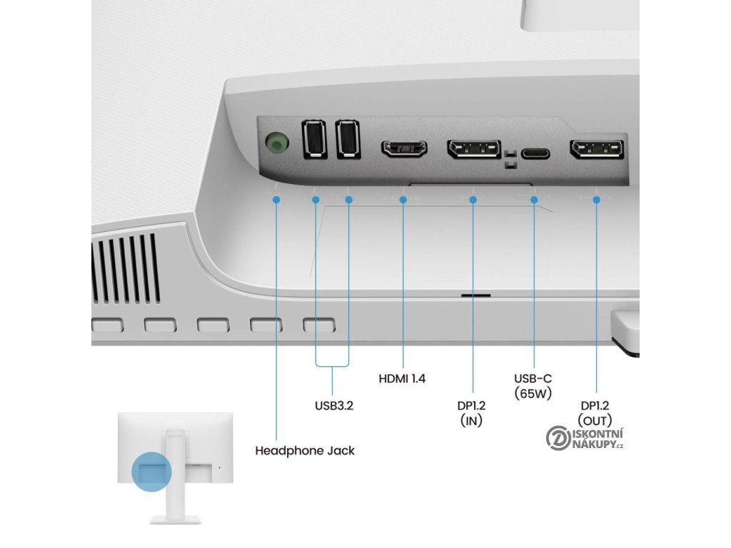 Rozhraní: 1× HDMI, 1× DisplayPort vstup, 1× DisplayPort výstup (MST Daisy Chain), 2× USB 3.2 Gen1 (USB 3.0), 1× USB-C (PD 65W, DP Alt mode), 1× výstup na sluchátka