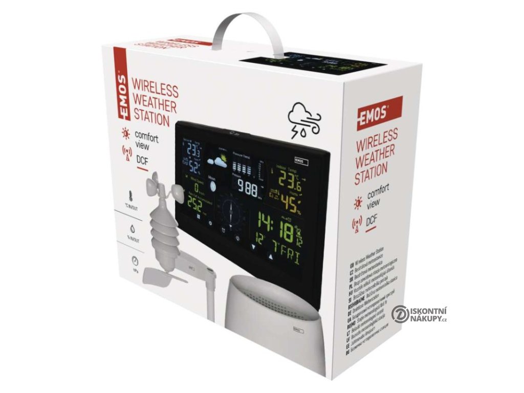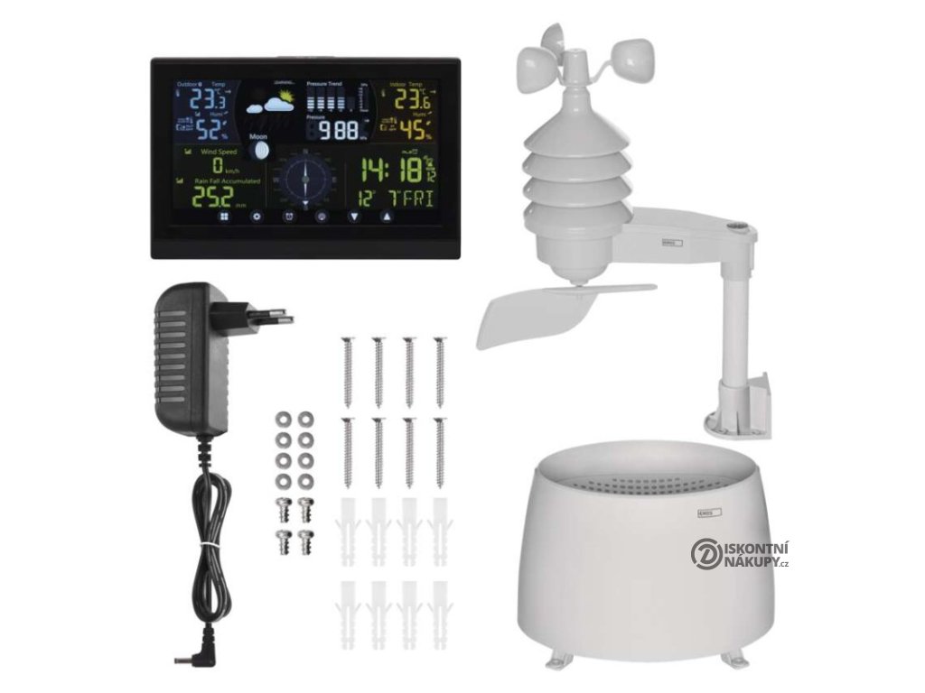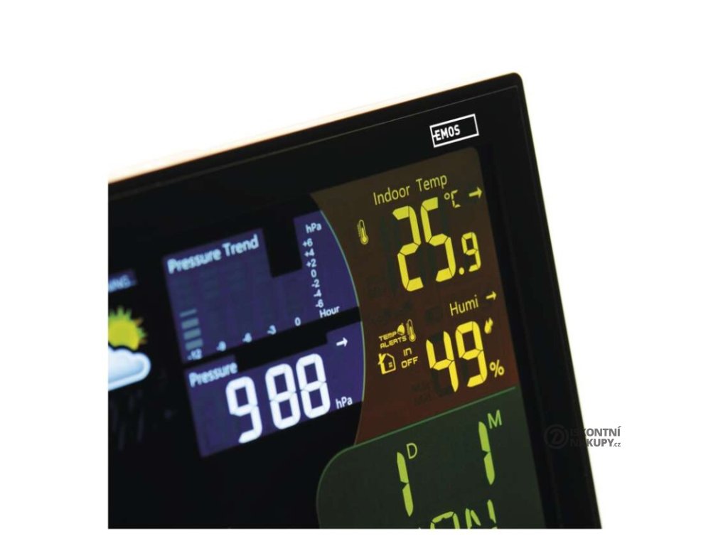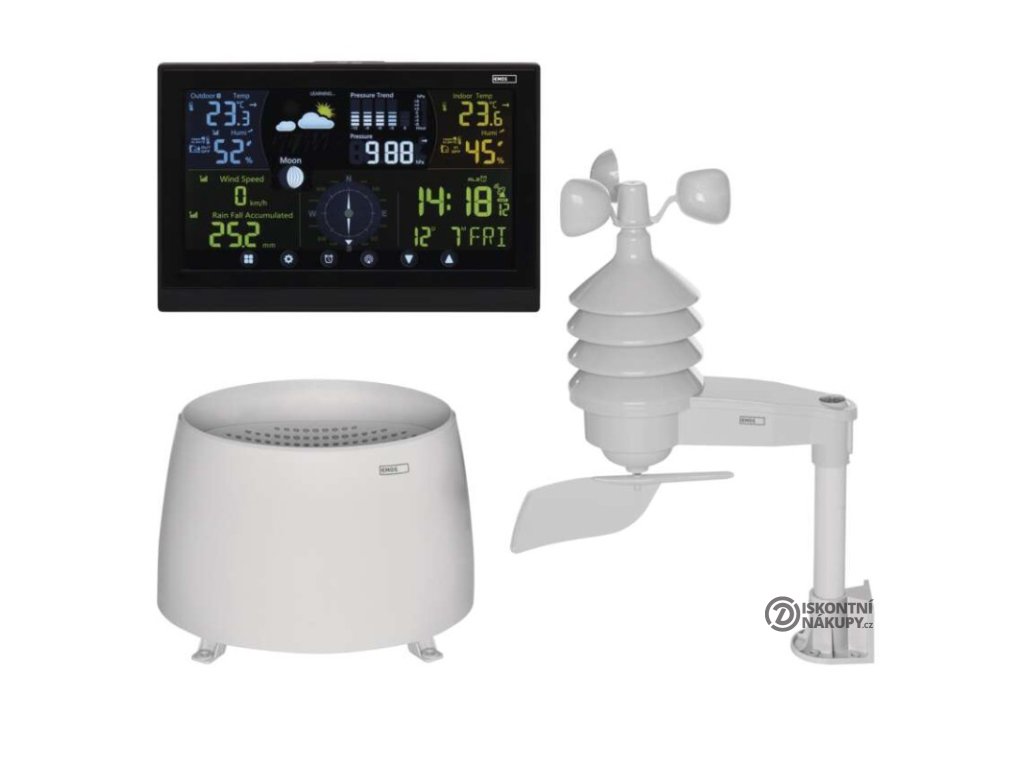 12/24 formát času: ano|anemometr: ano|barevný displej (black mask) podsvícený: ne|barometr: ano|budík: ano, 2×|časová pásma: ano|datum: ano|dosah čidla: až 100 m|drátová sonda k čidlu: ne|elektronické plošné podsvícení: ano|fáze měsíce: ano|hodiny: řízené DCF signálem|kalendář: ano|korekce nadmořské výšky: ano|LED podsvícení displeje: ano|min. a max. teplota: ano|možné další čidlo: až 3 čidla teploty a vlhkosti (E06018), 1 čidlo anemometru (E06016)|možnost nastavení jednotky teploty: °C/°F|možnost pověšení na zeď: ano|napájení čidla: 4× 1,5 V AA (nejsou součástí balení)|napájení stanice: 3× 1,5 V AAA (nejsou součástí balení)|opakované buzení: ano|předpověď počasí: ano|přenosová frekvence: 433 MHz|prodejní obal: 1 ks, krabička|produkt: meteostanice|projekce: ne|provedení: bezdrátové|rozměr čidla: 250 × 160 × 100 mm|rozměr hlavní jednotky: 17 × 192 × 127 mm|síťový adaptér: ano, 5 V DC/300 mA (součástí balení)|srážkoměr: ano|teplotní výstraha: ano|trend teploty: ano|trend tlaku: ano|trvalé podsvícení: ano|velikost displeje: 168 × 93 mm|venkovní teplota: -30 °C až +60 °C, rozlišení 0,1 °C|venkovní vlhkost: 1 % až 99 % RV, rozlišení 1 %|vnitřní teplota: -10 °C až +50 °C, rozlišení 0,1 °C|vnitřní vlhkost: 1 % až 99 % RV, rozlišení 1 %Popis produktu