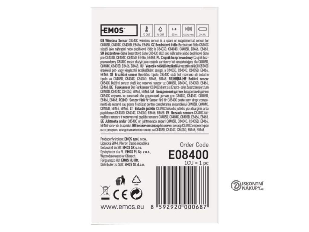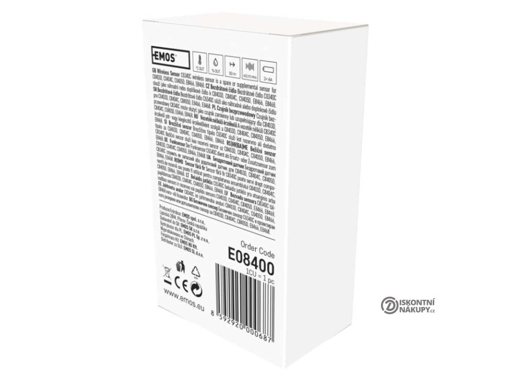 dosah ve volném prostoru: až 50 m|externí drátová teplotní sonda: ne|frekvence: 433 MHz|napájení: 2× 1,5 V AA (nejsou součástí balení)|prodejní obal: 1 ks, krabička|provozní teplota: -40 °C až +70 °C, rozlišení 0,1 °C|rozměr: 64 × 100 × 35 mm|ukazatel venkovní vlhkosti: 20 % až 90 % RV, rozlišení 1 %|určeno pro typ hlavní jednotky: C8403D, C8404C, C8405D, E8468, E8466Popis produktu