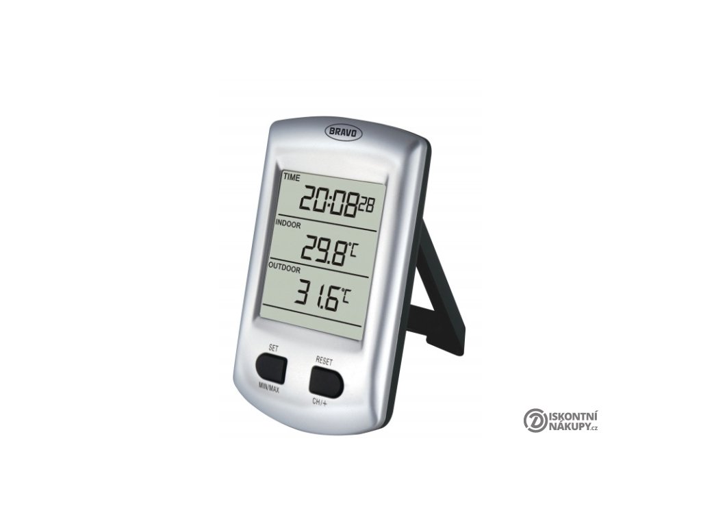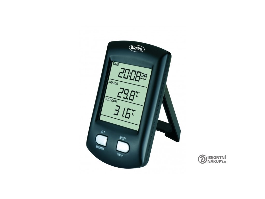 Moc pěkný design, jednoduché ovládání a krásná cena. Pokud nehledáte nepřeberné množství funkcí, potom je to výrobek pro vás. Tento model bezdrátového teploměru umí měřit vnitřní i vnější teplotu (vzdálený venkovní senzor). Uchovává záznamy minimální a maximální teploty. Na displeji si uživatel může nastavit 12 nebo 24 hodinový displej. Výhodou je snadné ovládání a možnost zavěšení na zeď nebo volné postavení. Napájení pomocí baterie AA 2 ks + 2ks AAA baterie. Baterie nejsou součástí balení. Venkovní čidlo má krytí IPX3 (odolné vůči dešti), dosah na volném prostranství minimálně 100m.