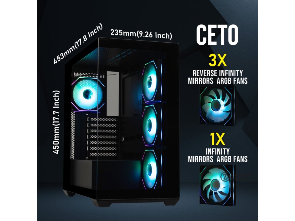 BitFenix CETO CubeHerní počítačová skříň nabízí stylovou prosklenou bočnici i přední panel a prvotřídní kovovou konstrukci. Skříň je osazena čtyřmi ventilátory o velikosti 120 mm s ARGB podsvícením a efektem nekonečného zrcadlení. Potěší také možnost rozšíření o další 3 ventilátory. Samozřejmostí jsou také prachové filtry. Důmyslné řešení umožňuje pohodlné umístění až 360 mm dlouhého výměníku vodního chlazení na horní straně. Ve skříni je dostatek prostoru pro chladič CPU do výšky až 181 mm a grafickou kartu o délce až 410 mm. Na horním panelu se nachází dva porty USB 3.0, jeden port USB-C, sluchátkový výstup a vstup pro mikrofon. Skříň je dodávána bez zdroje.