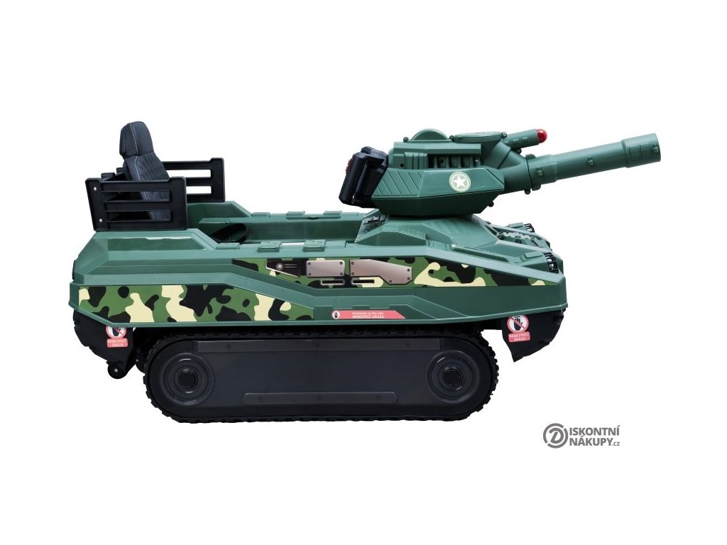 Komfort zajišťuje ergonomické kožené sedadlo s dvoubodovým bezpečnostním pásem. Tank je určen pro děti s maximální hmotností 30 kg a jeho robustní konstrukce s rozměry 125 × 61 × 61 cm poskytuje stabilitu a odolnost v různých terénech.