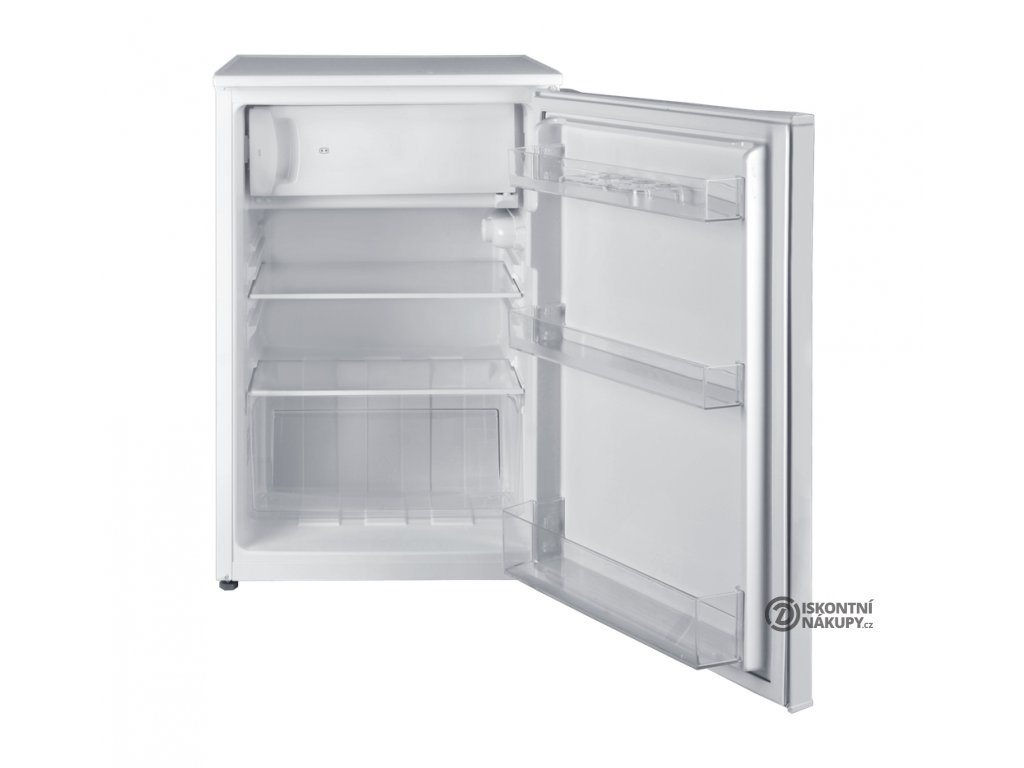 Jednodveřová chladnička Table Top s mrazákem nahoře; bílé provedení; Energetická třída E; klimatická třída N-T; celkový užitný objem 122 l; možnost změny směru otevírání dveří; výškově stavitelné nožky vpředu; elektronické řízení teploty s manuálním ovládáním; roční spotřeba energie 145 kWh; hlučnost 40 dB; rozměry (VxŠxH): 84 x 54 x 59,5 cm; hmotnost: 31 kg