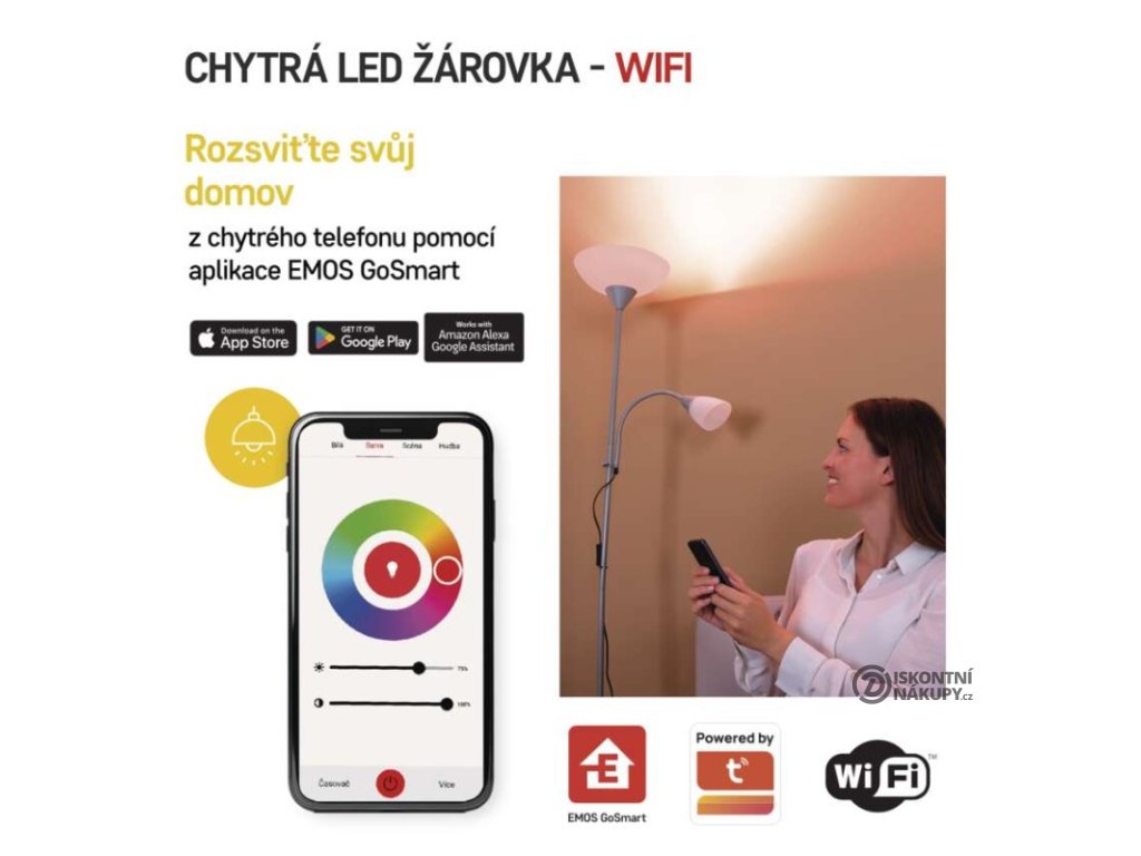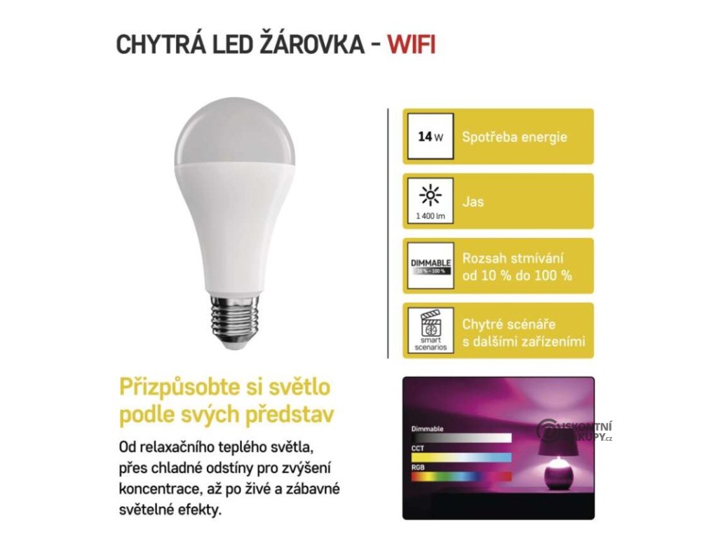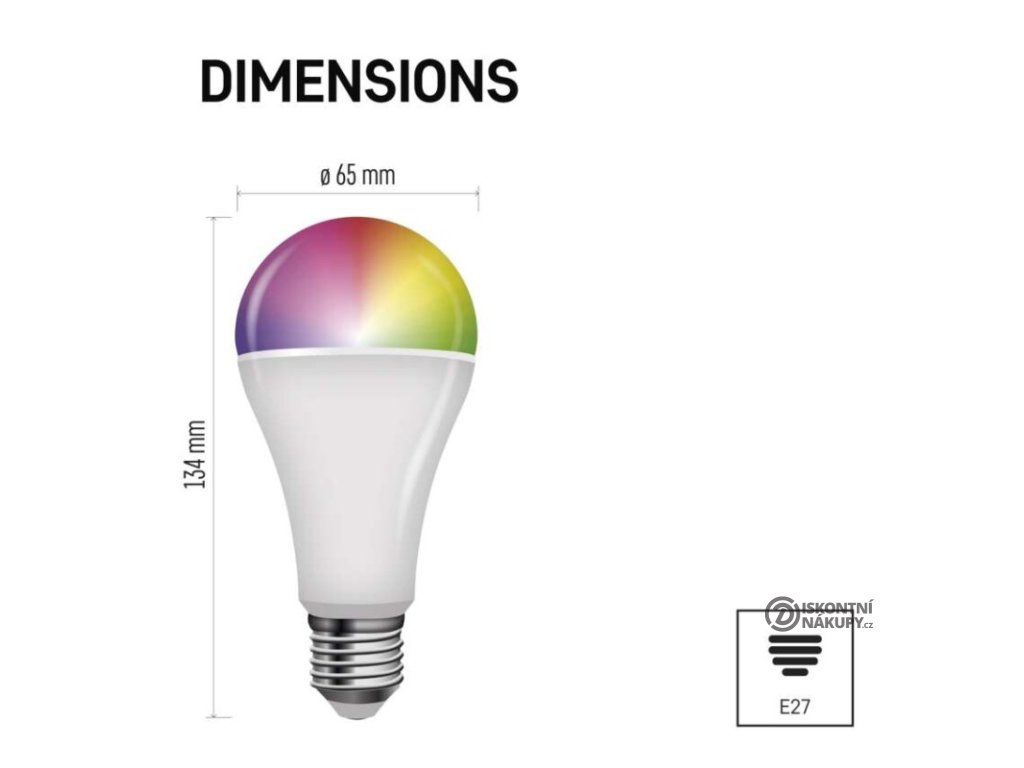 barva světla: RGB|energetická třída: F|index podání barev (CRI): 80|kompatibilita: EMOS GoSmart, TUYA, LIDL, Smartlife|náhrada za žárovku: 94 W|napětí: 230 V~/50 Hz|nastavení barev (RGB): ano|notifikace do mobilní aplikace: ano|ovládání hlasovými asistenty: ano (Amazon Alexa, Google Assistant)|patice (uchycení žárovky): E27|počet čipů: neuvádí se|počet spínacích cyklů: 15 000|podporované OS: Android, iOS|přenosová frekvence: 2,4 GHz WIFI|příkon: 14 W|prodejní obal: 1 ks, krabička|protokol: Wi-Fi|řada: GoSmart|rozměr: 65 × 65 × 134 mm|stmívatelná: ano|světelná účinnost: 100 lm/W|světelný tok: 1 400 lm|technologie: LED|teplota chromatičnosti: 2 700–6 500 K|tvar: A65|typ čipů: SMD|účiník: 0,65|úhel vyzařování: 200°|záruční doba: 2 roky|životnost: 20 000 hodinDoplňkové parametry