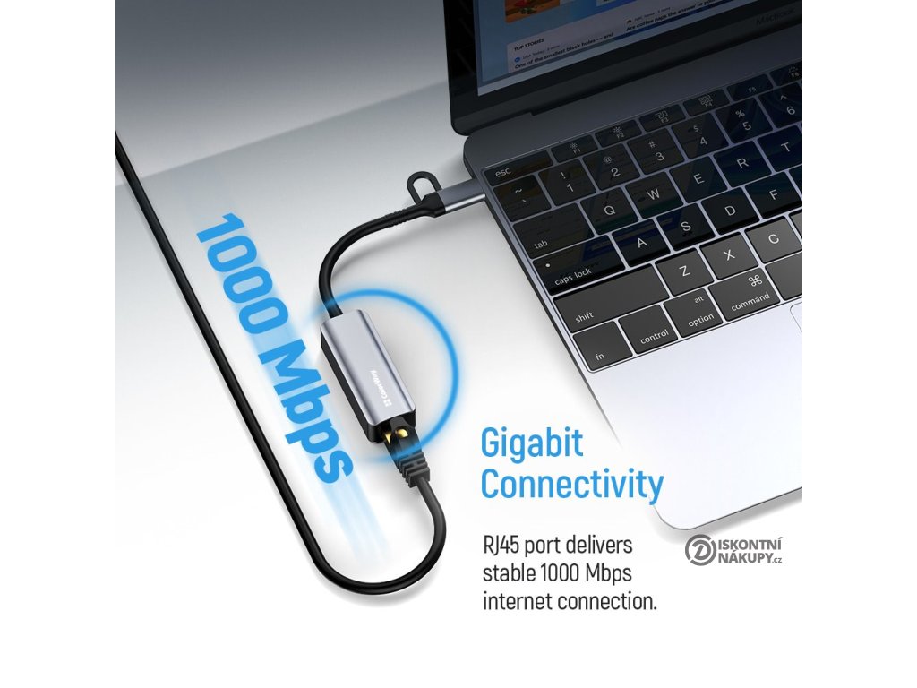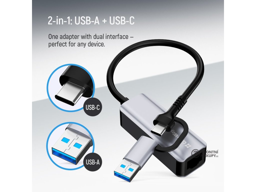 Univerzální síťový adaptér pro rychlé připojení k drátové síti přes USB nebo USB-C port.