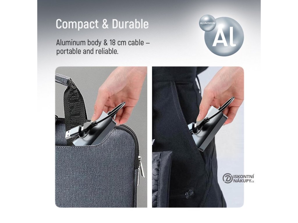 - Kompaktní hliníková konstrukce s integrovaným 18cm kabelem