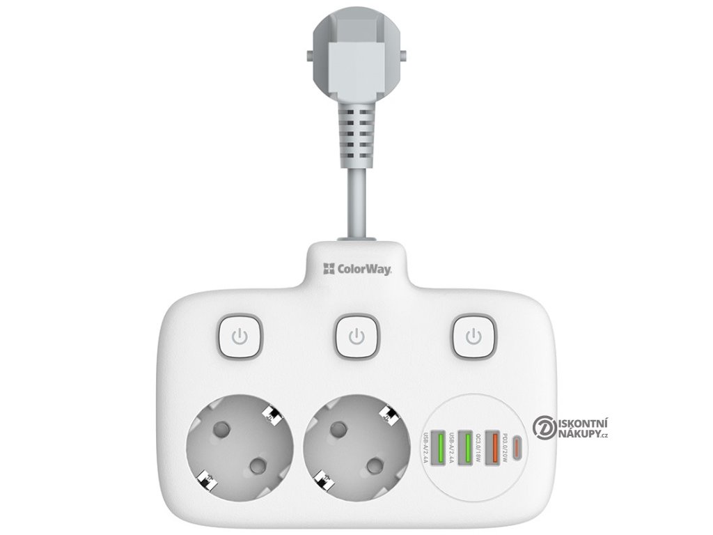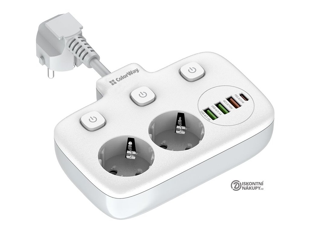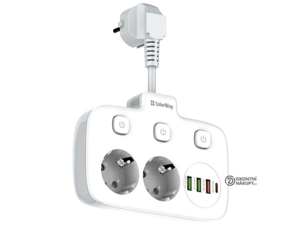 ColorWay CW-CHE24PDWKompaktní prodlužovací přívod se dvěma Schuko zásuvkami, třemi USB porty a jedním USB-C konektorem. Lze s ním tedy připojit nejen elektrické spotřebiče, ale současně nabíjet až čtyři mobilní zařízení z USB portů. Funkce Auto ID automaticky rozpozná typ připojeného zařízení a určí tak vhodný nabíjecí proud. Mezi podporované nabíjecí protokoly patří PD 2.0/3.0 PPS, Quick Charge 2.0/3.0, Apple Fast Charge, Huawei FCP, Samsung SFC/AFC a Xiaomi Turbo charge. Zásuvky a USB výstupy jsou vybaveny praktickým tlačítkem pro zapnutí a vypnutí. Tělo přívodu je vyrobeno ze žáruvzdorného plastu, který odolá teplotám až do 850 °C. Samozřejmostí je uzemnění a přepěťová ochrana.