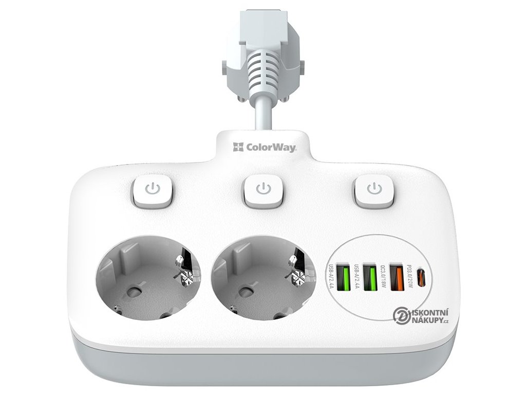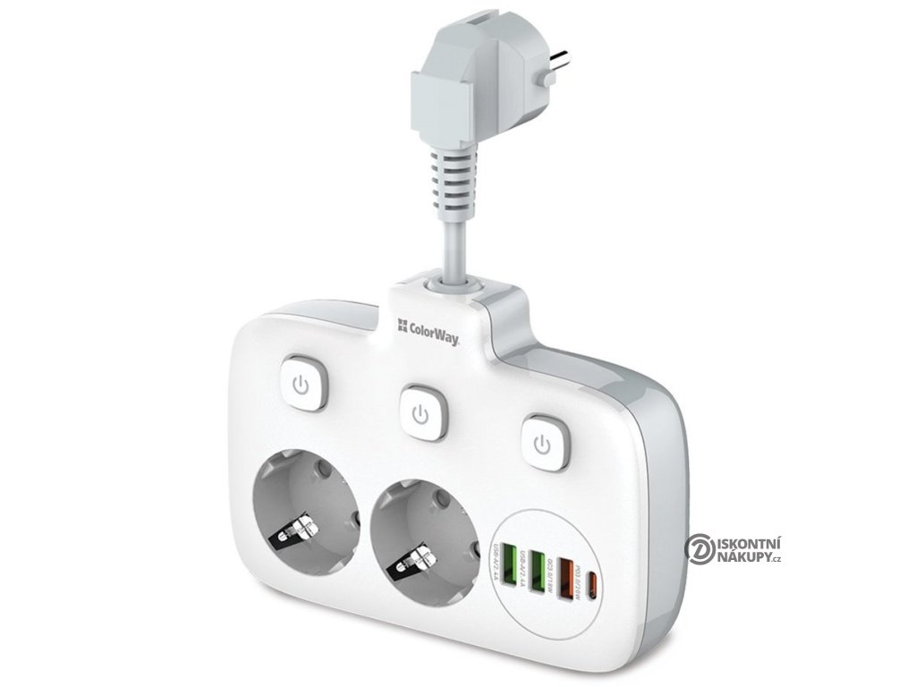 COLORWAY Prodlužovací napájecí přívod/ 2x Schuko/ 3x USB-A/ 1x USB-C / kabel 2,5cm CW-CHE24PDW