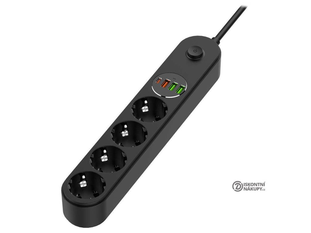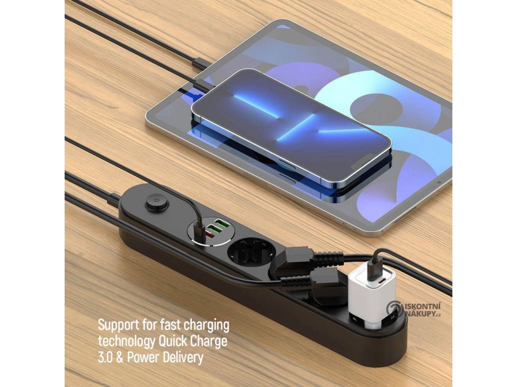 ColorWay CW-CHE44PDBKompaktní prodlužovací přívod se čtyřmi Schuko zástrčkami, třemi porty USB 2.0 podporující technologii Quick Charge 3.0 a jedním USB-C portem podporující technologii Power Delivery. Lze s ním tedy připojit nejen elektrické spotřebiče, ale současně nabíjet až čtyři mobilní zařízení z portu USB do max. výkonu 45 W. Tlačítko zapnutí/vypnutí a indikace LED zajistí ještě pohodlnější používání. Prodlužovací kabel je vybaven uzemněním a přepěťovou ochranou, což zajišťuje bezpečné používání.