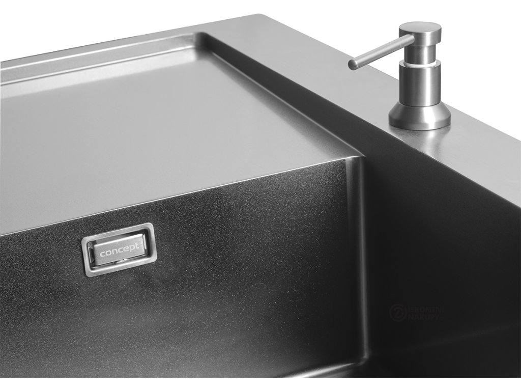 Součástí dřezu je integrovaný dávkovač saponátu s kapacitou 350 ml, který je zpracován ve stejném designu jako dřez. Dávkovač je zapuštěn přímo do dřezu, což přestavuje velice praktické řešení zlepšující komfort a hygienu při mytí nádobí.