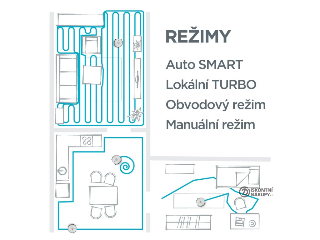 Robot nabízí 4 režimy úklidu. V režimu Auto SMART se vysavač efektivně a systematicky pohybuje v liniích po celém prostoru a na závěr provede úklid podél stěn. V lokálním TURBO režimu se pohybuje ve spirále a vysává na maximální výkon v konkrétním místě. S obvodovým režimem docílíte perfektního úklidu podél stěn. Pomocí manuálního režimu můžete vysavač navést přesně tam, kde zrovna potřebujete uklidit.