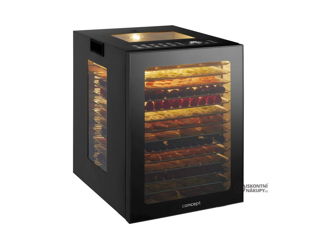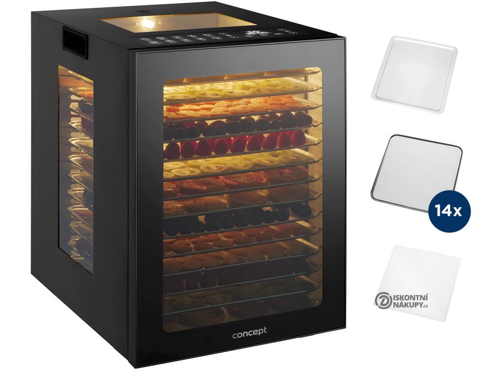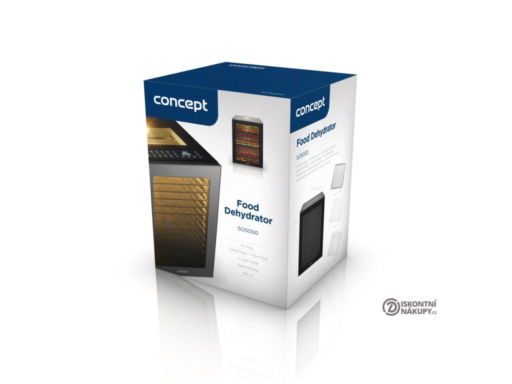 Sušička ovoce Concept SO5000 s příkonem 850 W si efektivně a rychle poradí i s velkým množstvím surovin, které můžete sušit na 14 nerezových platech. Hlavní výhodou nerezových plat je jejich vysoká trvanlivost, odolnost proti bakteriím, plísním a jiným mikroorganismům a snadná údržba. Současně urychlují proces sušení, protože se během provozu nahřívají. Díky horizontálnímu proudění vzduchu sušička garantuje rovnoměrné sušení ve všech patrech. Vnitřní osvětlení a výsuvný systém usnadňují vaši kontrolu.