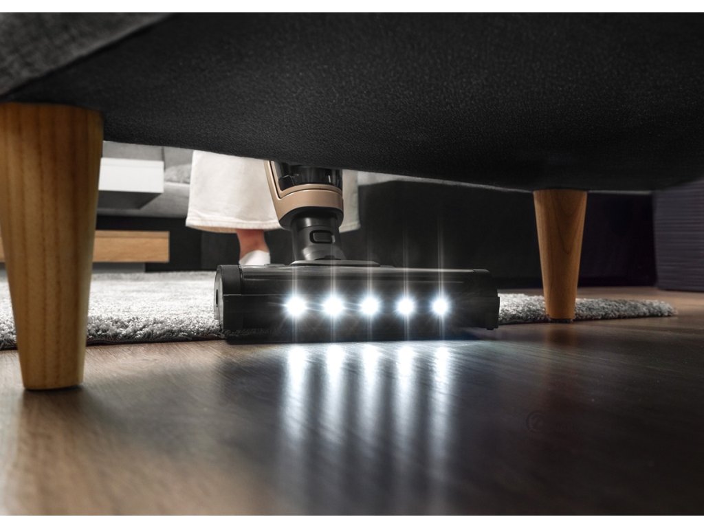 LED osvětlení umístěné na turbokartáči skvěle nasvítí prostor před vysavačem, takže vám neunikne ani smítko pod nábytkem nebo v hůře dostupných koutech.