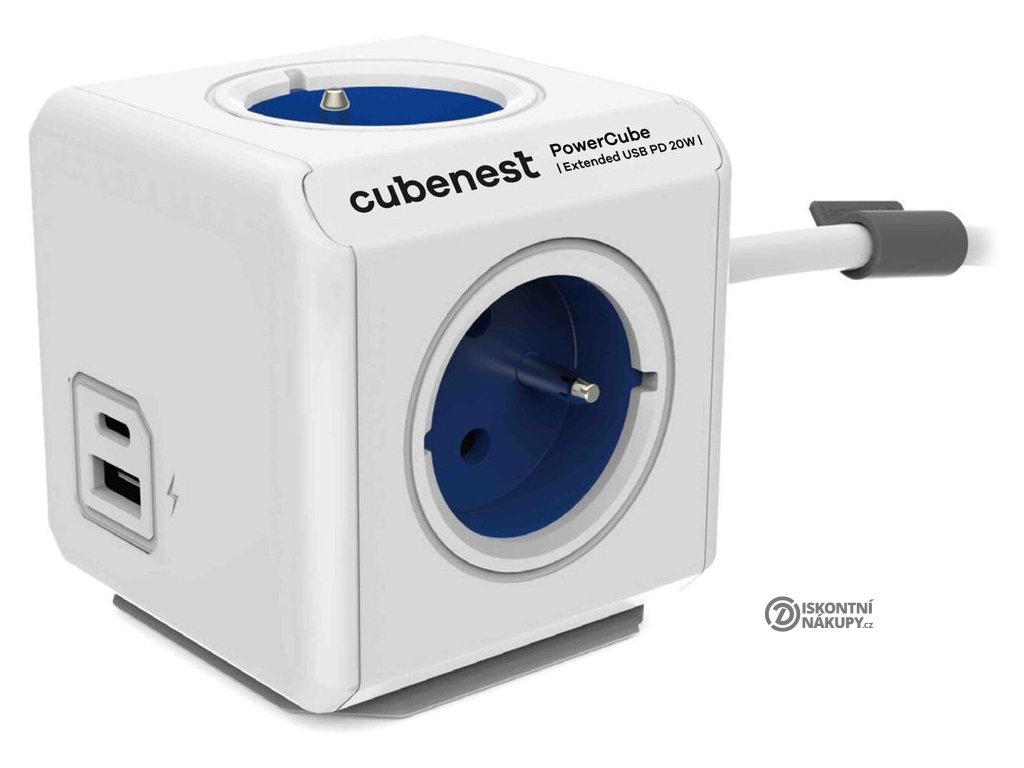 Cubenest Powercube Extended USB PD 20W, A+C, 4× zásuvka, 1,5m, bílá/modrá, dětská pojistka, uzemnění, dok, 10A/250V PC420BL