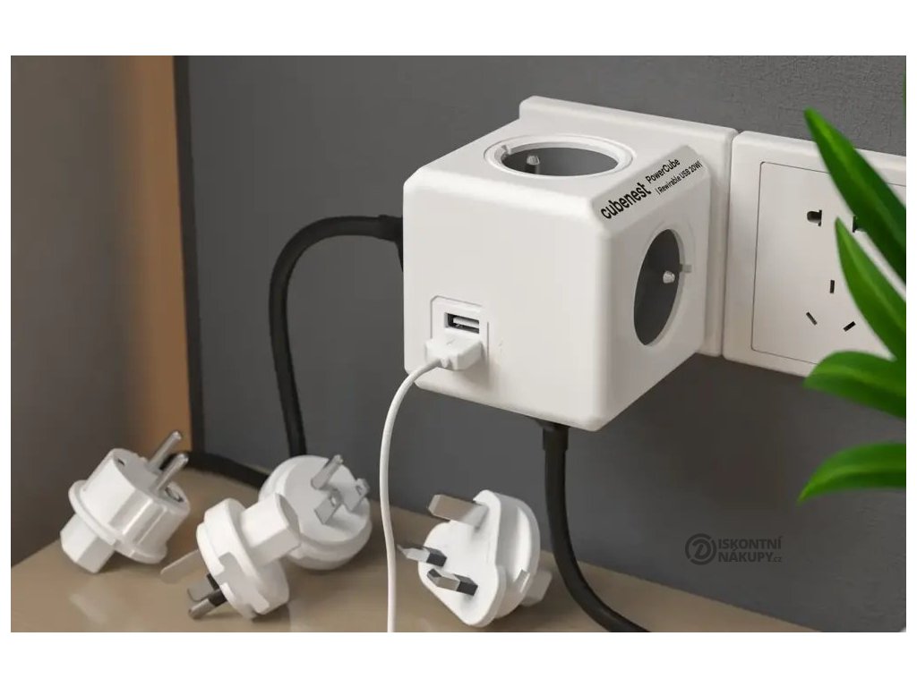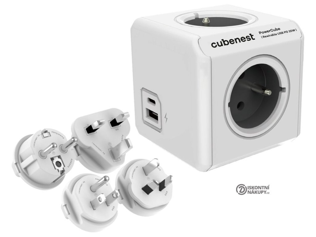 Cubenest Powercube ReWirable USB PD 20W, A+C, 4× zásuvka, bílá/šedá, 4 cestovní koncovky, dětská pojistka, uzemnění PC620GY