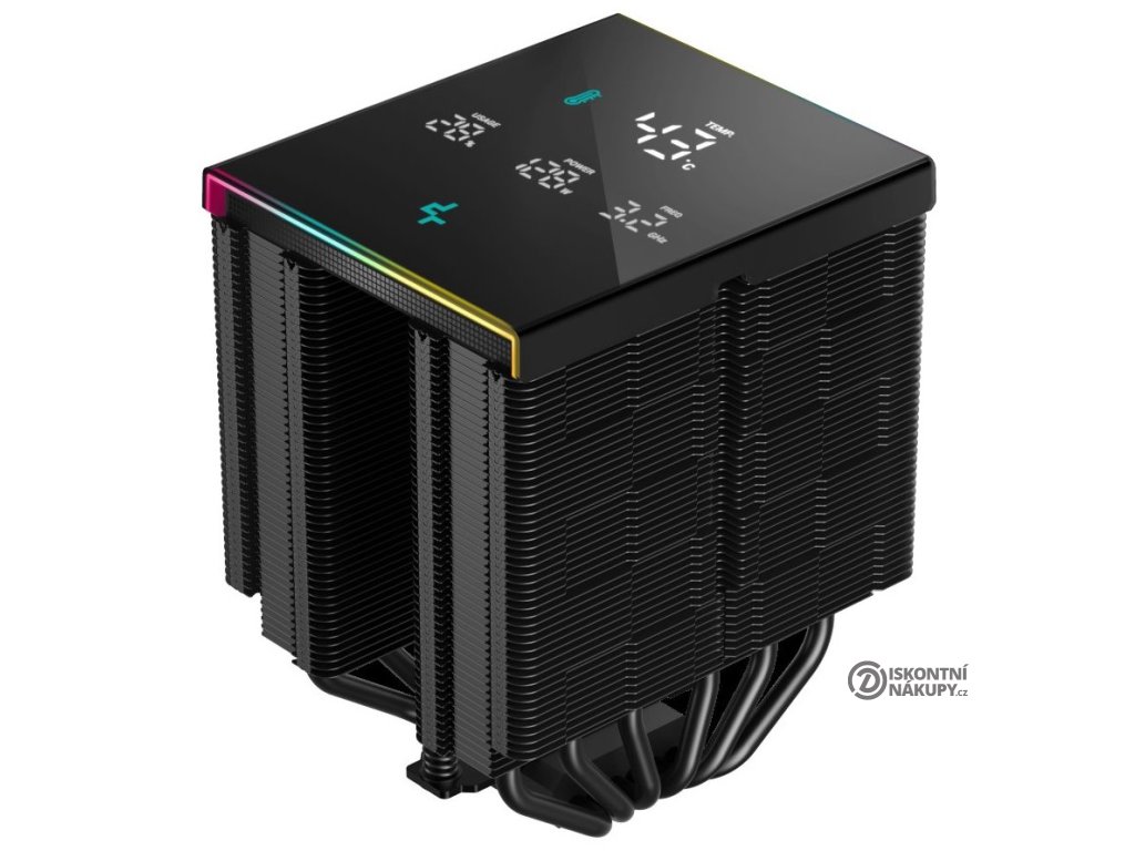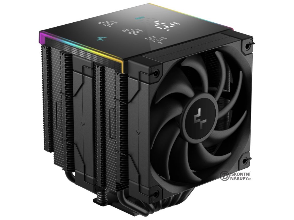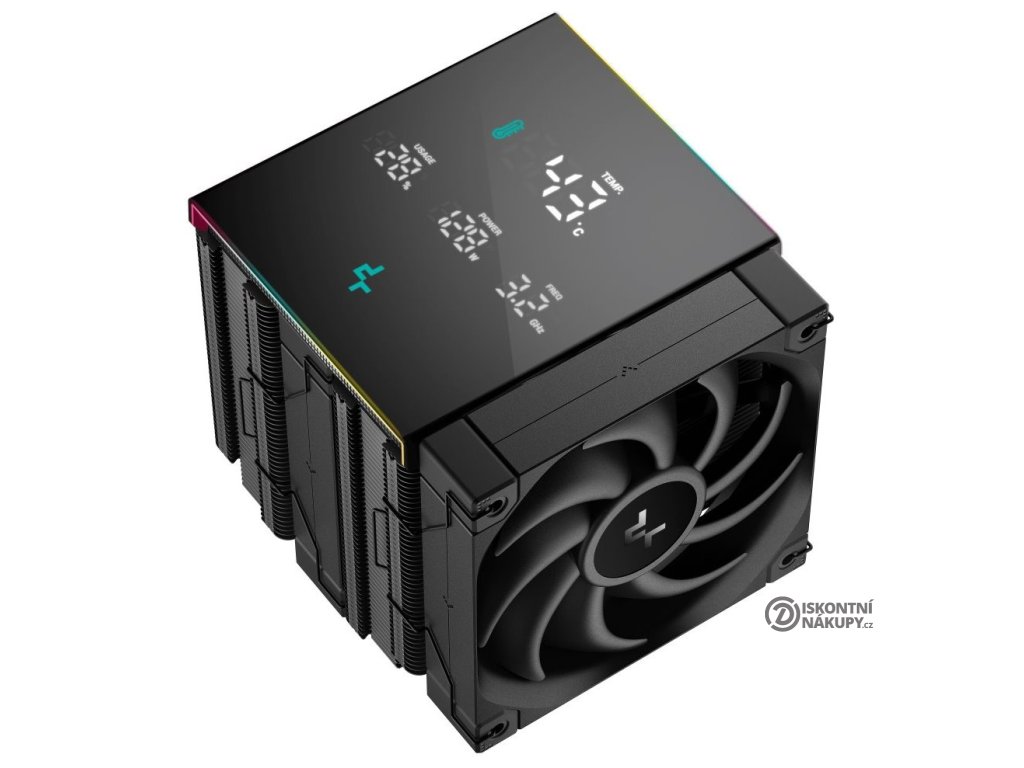 DEEPCOOL AK620 Digital ProChladič pro procesory Intel i AMD je vybaven šesti heatpipe a dvěma 120mm ventilátory s PWM regulací. Předností chladiče je ARGB podsvícení a praktický digitální displej, který zobrazuje teplotu, využití, spotřebu a frekvenci procesoru v reálném čase. Samozřejmostí je upozornění, pokud je teplota příliš vysoká. K připojení slouží 4pin PWM, 3pin ARGB a 9pin USB konektor.