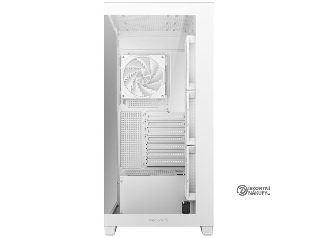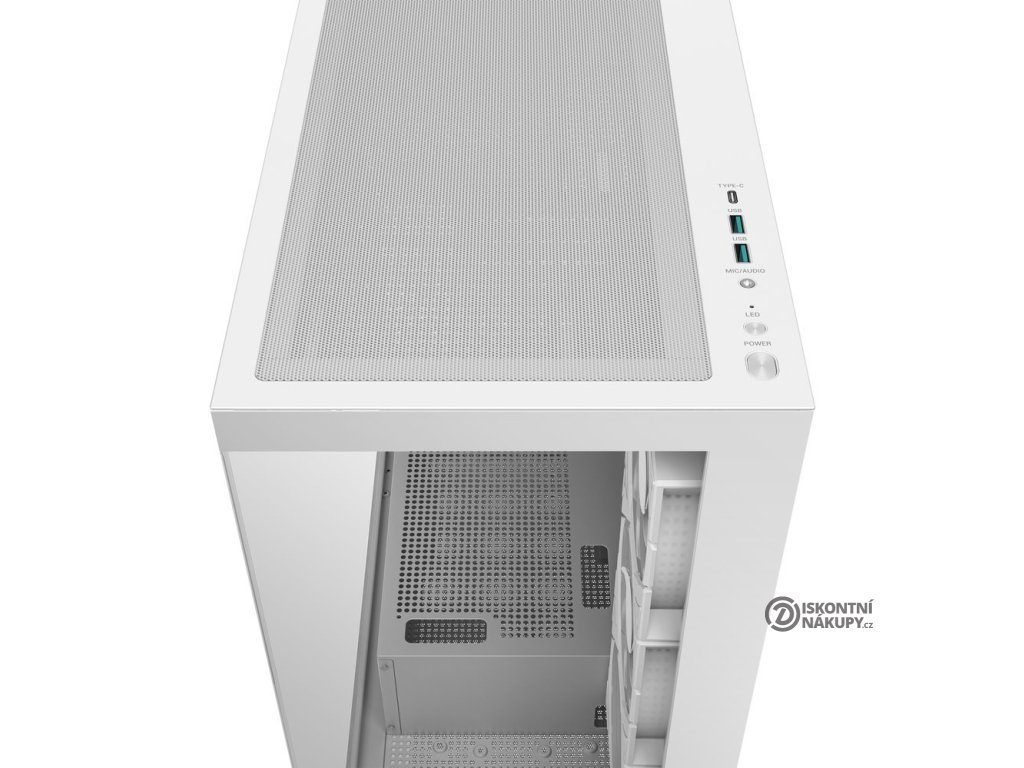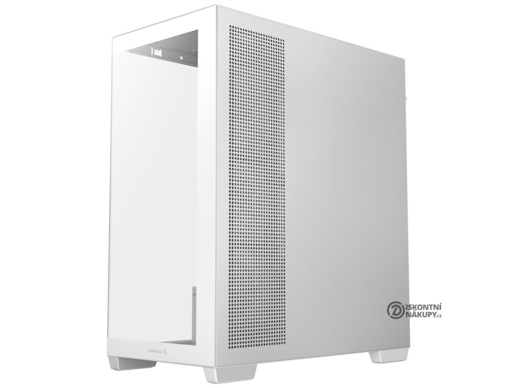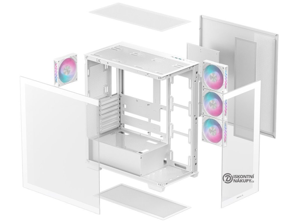 DEEPCOOL CG580 4FJednokomorová skříň formátu Middle Tower se skleněnou bočnicí a předním panelem nabízející výhled v úhlu 270°. K dispozici jsou dvě 2,5" pozice pro SSD disky a dvě 3,5" pozice pro pevné disky. Na horním panelu se nachází dva USB 3.0 porty, USB-C port a kombinovaný port sluchátek a mikrofonu. Skříň je osazena čtyřmi 120mm PWM ventilátory s ARGB podsvícením. Důmyslné řešení umožňuje pohodlné umístění až 360 mm dlouhého výměníku vodního chlazení na horní nebo boční straně. Ve skříni je dostatek prostoru pro chladič CPU do výšky až 176 mm a grafickou kartu o délce 410 mm (v případě instalace 360mm výměníku vodního chlazení na boční straně max. 262 mm). Skříň je dodávána bez zdroje. Součástí balení je také sada magnetických prachových filtrů.