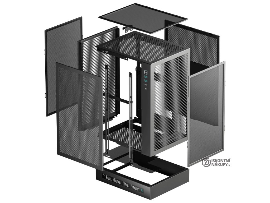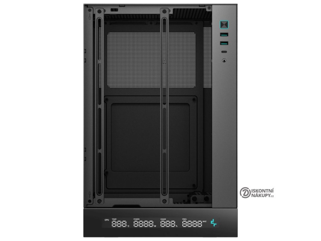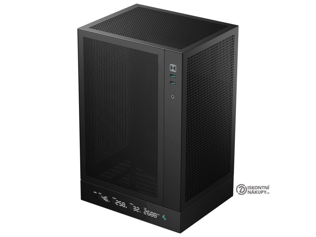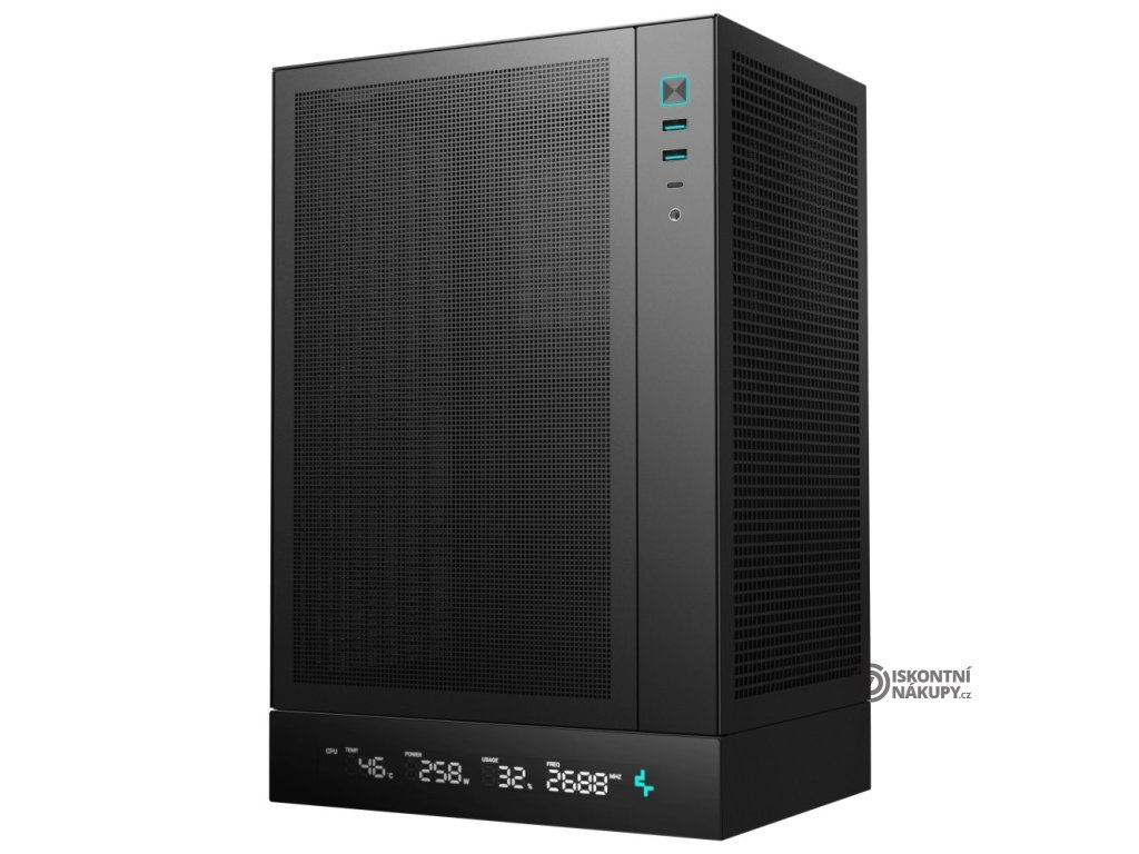 DEEPCOOL CH170 DigitalVertikální stylová skříň formátu Mini ITX nabízí jednu 2,5/3,5" pozici pro SSD/HDD disk. Potěší také možnost osazení až šesti ventilátory (po instalaci disku není možné přidat přední ventilátor). Na boční straně se nachází dva USB 3.0 porty, jeden port USB-C a kombinovaný audio port pro sluchátka a mikrofon. Důmyslné řešení umožňuje pohodlné umístění až 240 mm dlouhého výměníku vodního chlazení na boční straně. Ve skříni je dostatek prostoru pro chladič CPU do výšky až 172 mm a grafickou kartu o délce až 305 mm při použití zdroje SFX/SFX-L a 230 mm při použití zdroje ATX). Základna skříně obsahuje digitální displej, který zobrazuje aktuální teplotu, výkon, spotřebu a otáčky ventilátorů. Displej se může v daném okamžiku zaměřit na tyto hodnoty u procesoru, grafické karty nebo napájecího zdroje. Mesh panely ze všech stran zajistí vysoký průtok vzduchu. Skříň je dodávána bez zdroje a součástí balení je sada odnímatelných prachových filtrů.