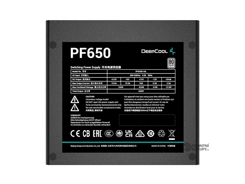 DEEPCOOL PF650 650 WNapájecí zdroj osazen tichým 120 mm ventilátorem. Účinnost zdroje splňuje certifikaci 80PLUS Standard.