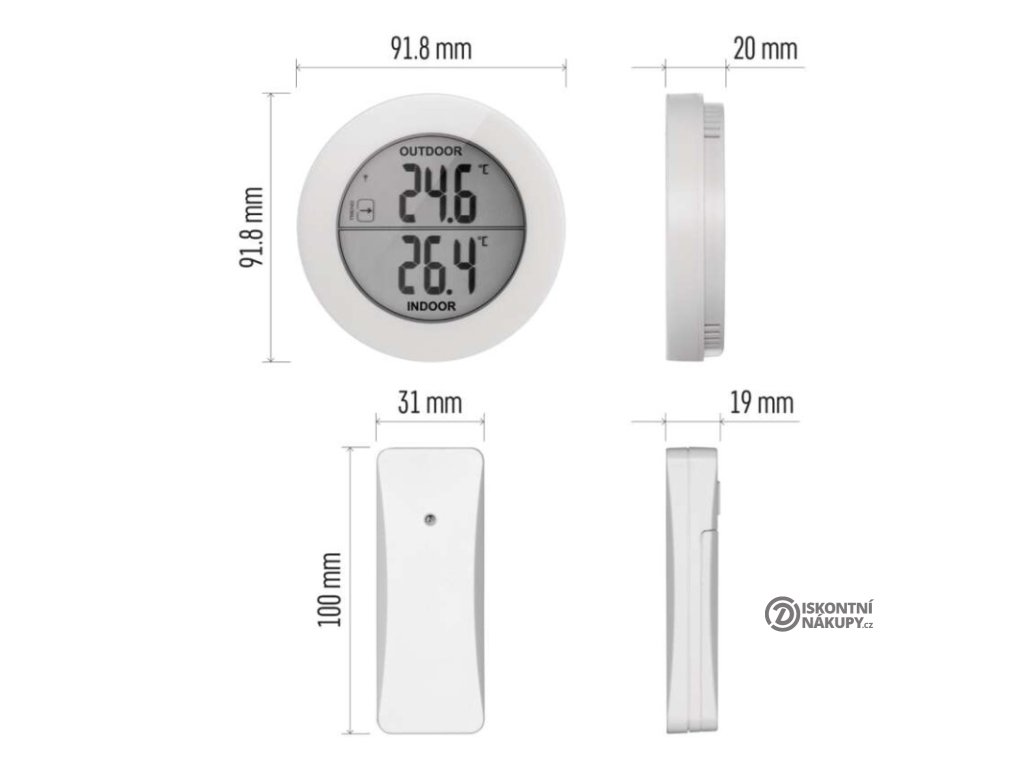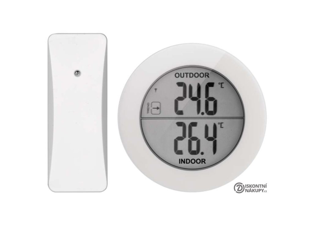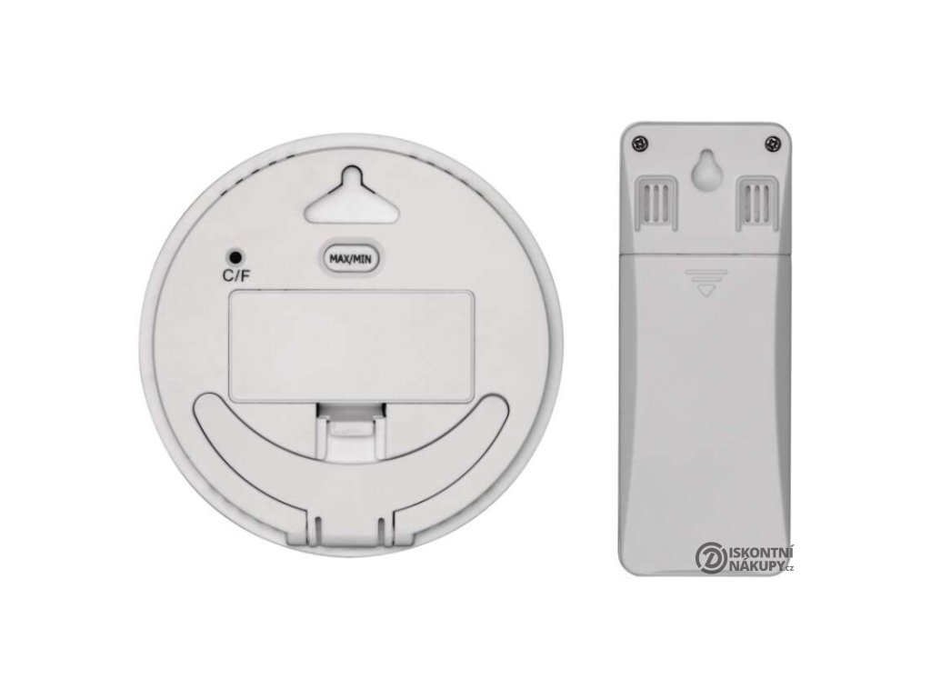 12/24 formát času: ne|barevný displej (black mask) podsvícený: ne|budík: ne|časová pásma: ne|datum: ne|dosah ve volném prostoru: až 80 m|drátová sonda k čidlu: ne|funkce stopky: ne|hodiny: ne|kalendář: ne|LED podsvícení displeje: ne|magnet na připevnění: ne|min. a max. teplota: ano|možné další čidlo: 1 (E05018)|možnost nastavení jednotky teploty: ano|možnost pověšení na zeď: ano|napájení čidla: 2× 1,5 V AAA (nejsou součástí balení)|napájení stanice: 2× 1,5 V AAA (nejsou součástí balení)|odpočet času max. od: ne|opakované buzení: ne|paměť poslední hodnoty: ne|přenosová frekvence: 433 MHz|prodejní obal: 1 ks, krabička|provedení teploměru: bezdrátový|rozměr čidla: 31 × 19 × 100 mm|rozměr hlavní jednotky: 91,8 × 20 × 91,8 mm|síťový adaptér: ne|teplotní index: ne|teplotní výstraha: ne|trend teploty: ano|trend tlaku: ne|trvalé podsvícení: ne|velikost displeje: Ø 64 mm|venkovní teplota: -30 °C až +50 °C, rozlišení 0,1 °C|venkovní vlhkost: ne|vnitřní teplota: -10 °C až +50 °C, rozlišení 0,1 °C|vnitřní vlhkost: nePopis produktu