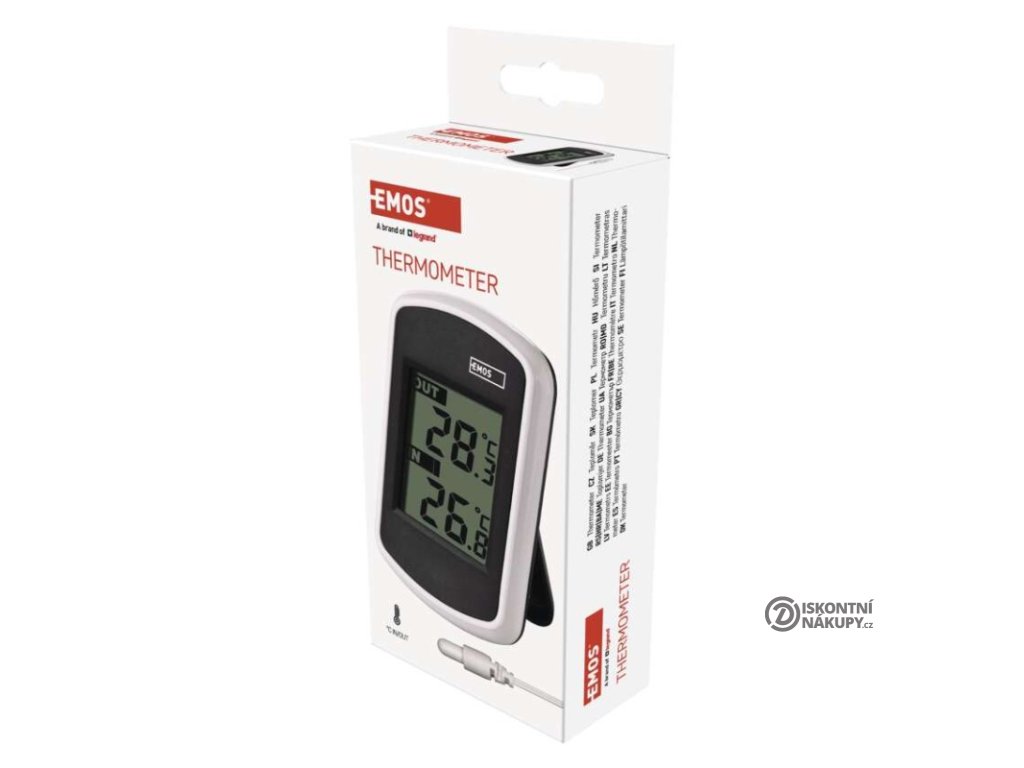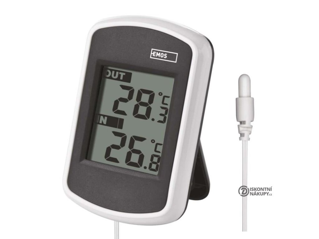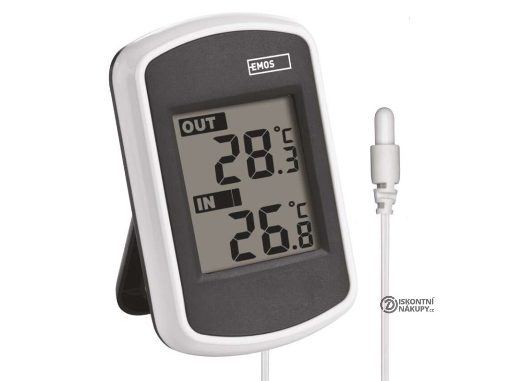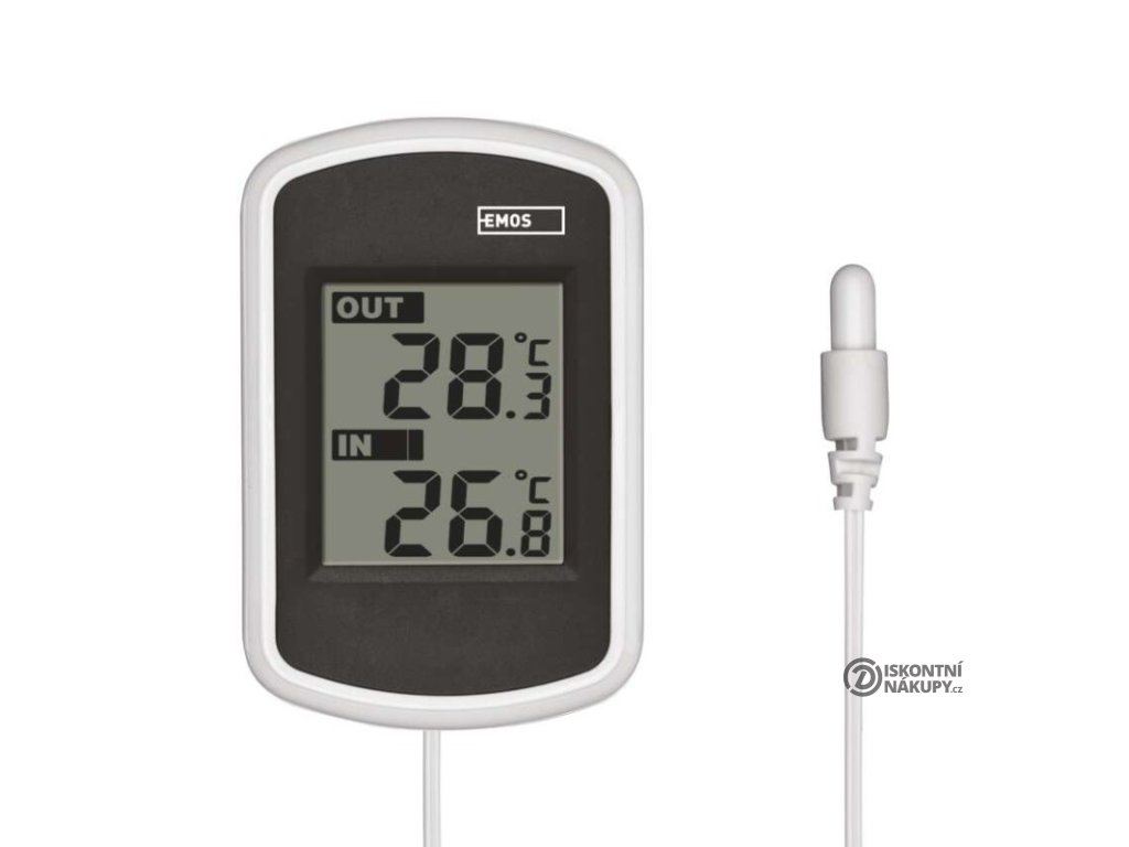 Drátový teploměr se zobrazením venkovní a vnitřní teploty. Teploměr má drátovou sondu v délce 2 m.