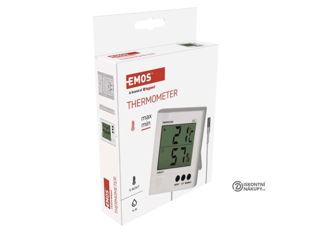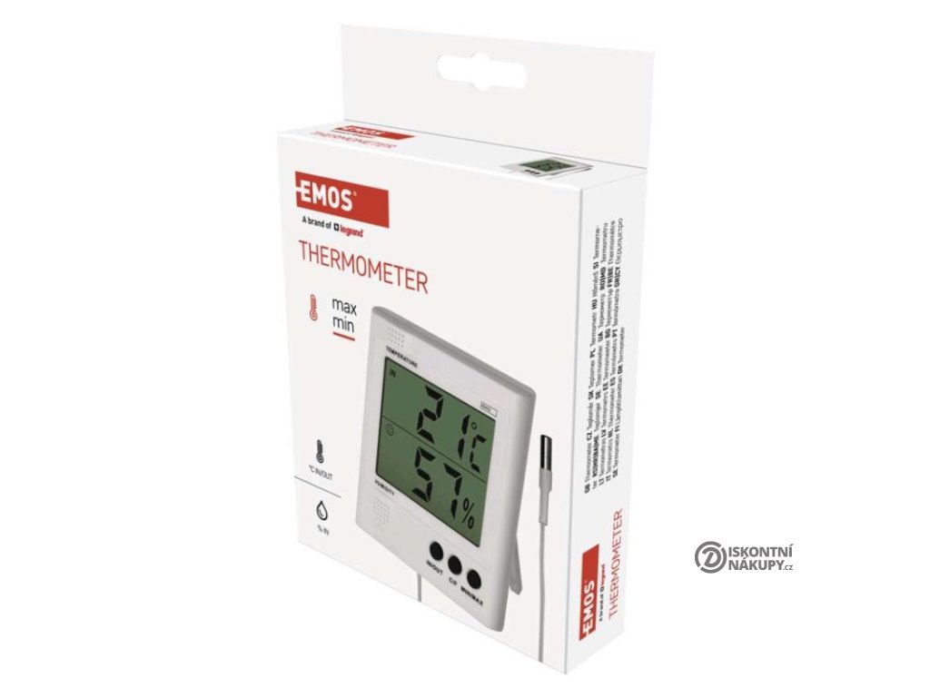 Digitální teploměr s drátovou sondou. Teploměr zaznamenává vnitřní a venkovní teplotu, vnitřní vlhkost, min. a max. teplotu a varuje před námrazou. Sonda teploměru má délku 2 m.
