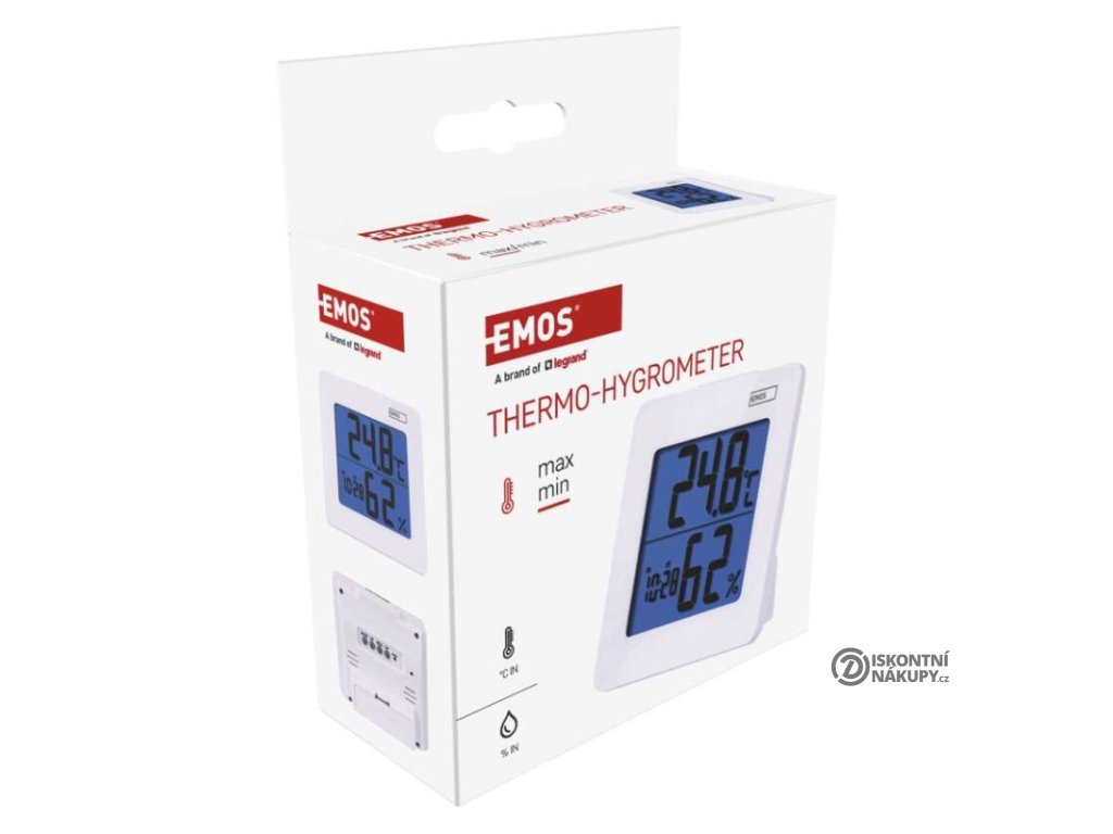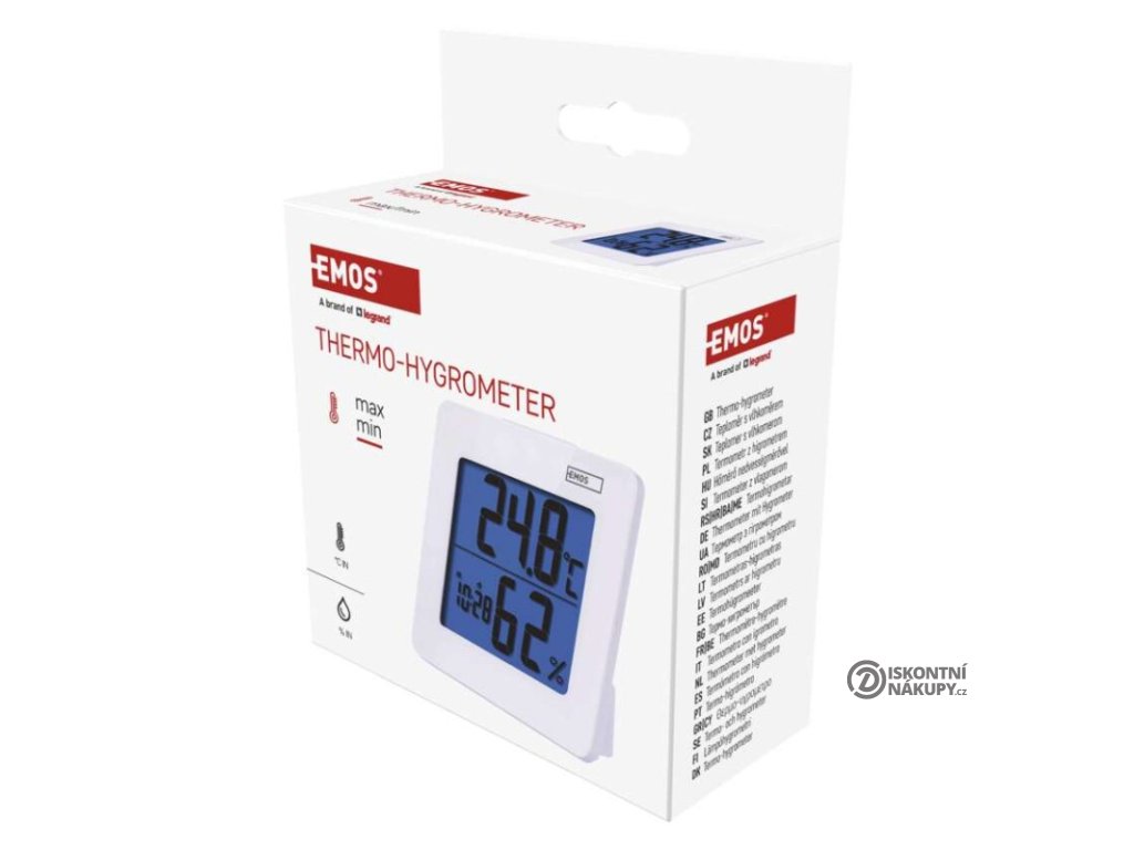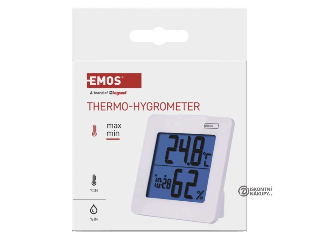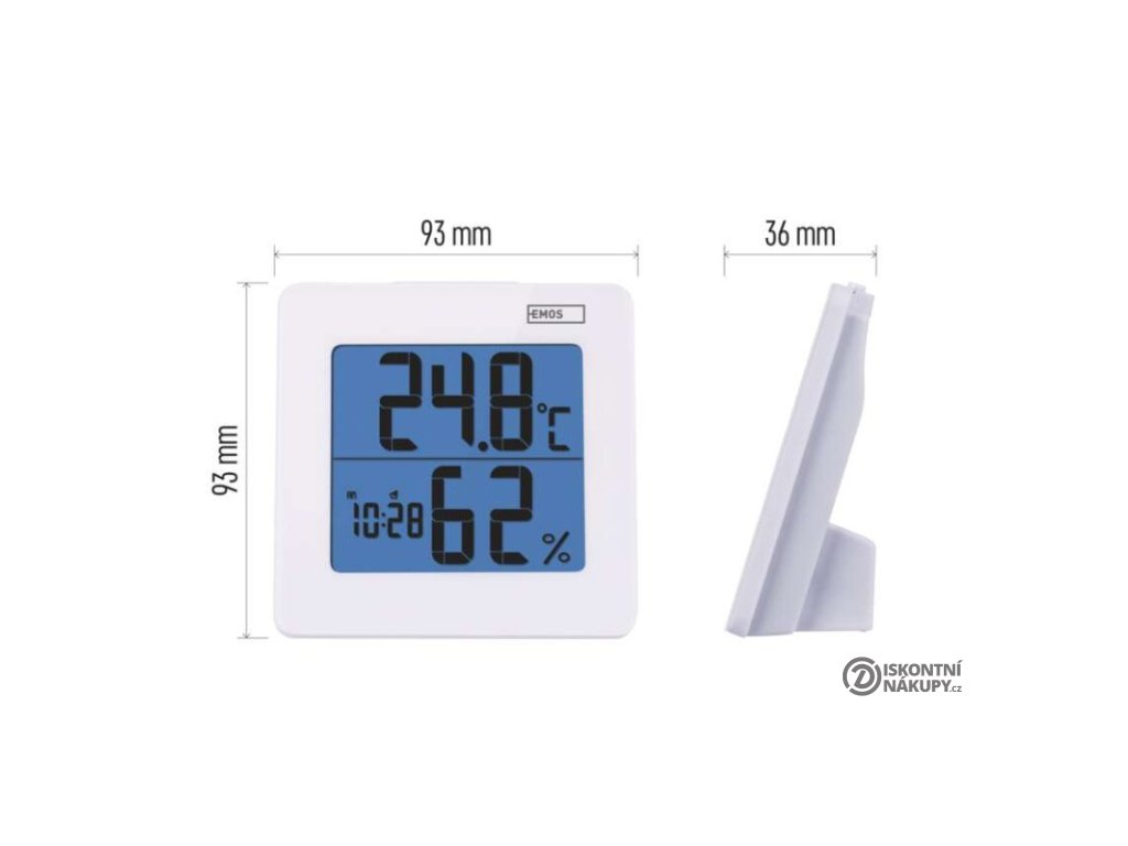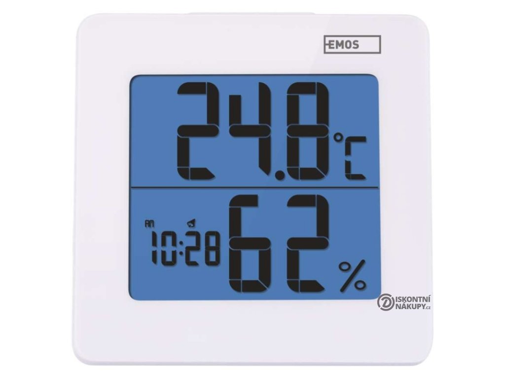 Teploměr v bílé barvě s hodinami řízenými Quarz krystalem. Teploměr má podsvícení displeje, zobrazuje vnitřní teplotu a vlhkost, hodiny, datum a má budík.