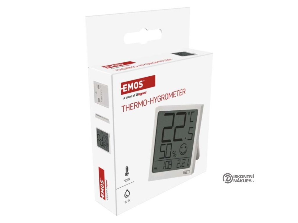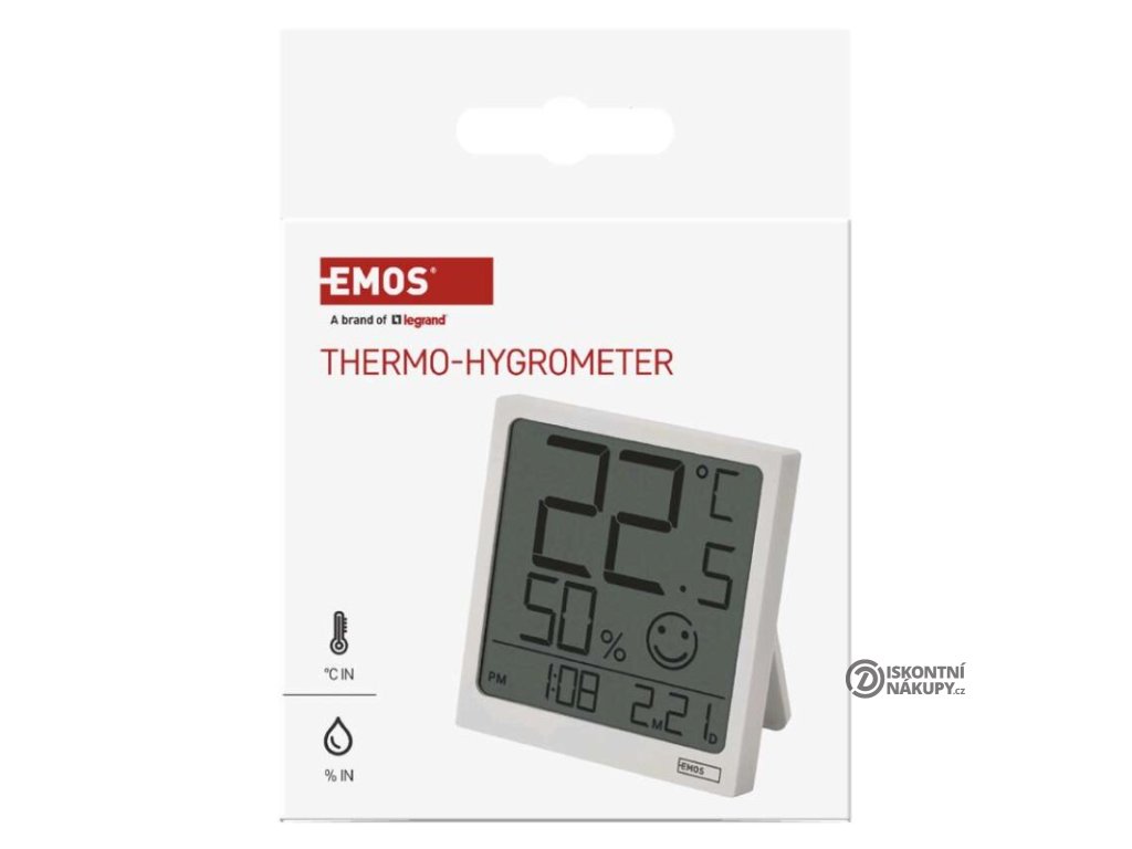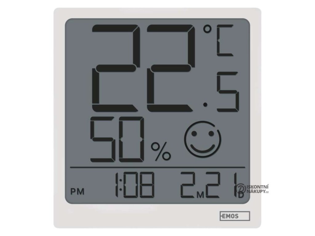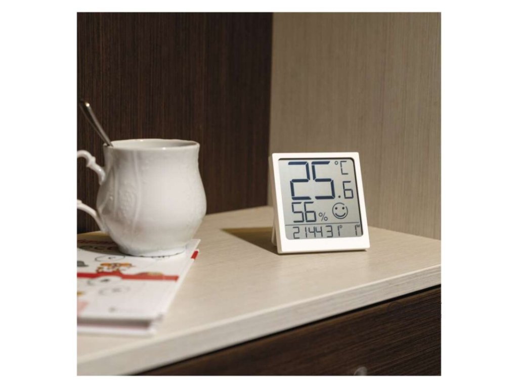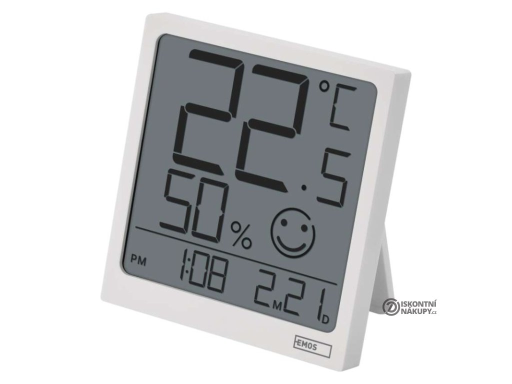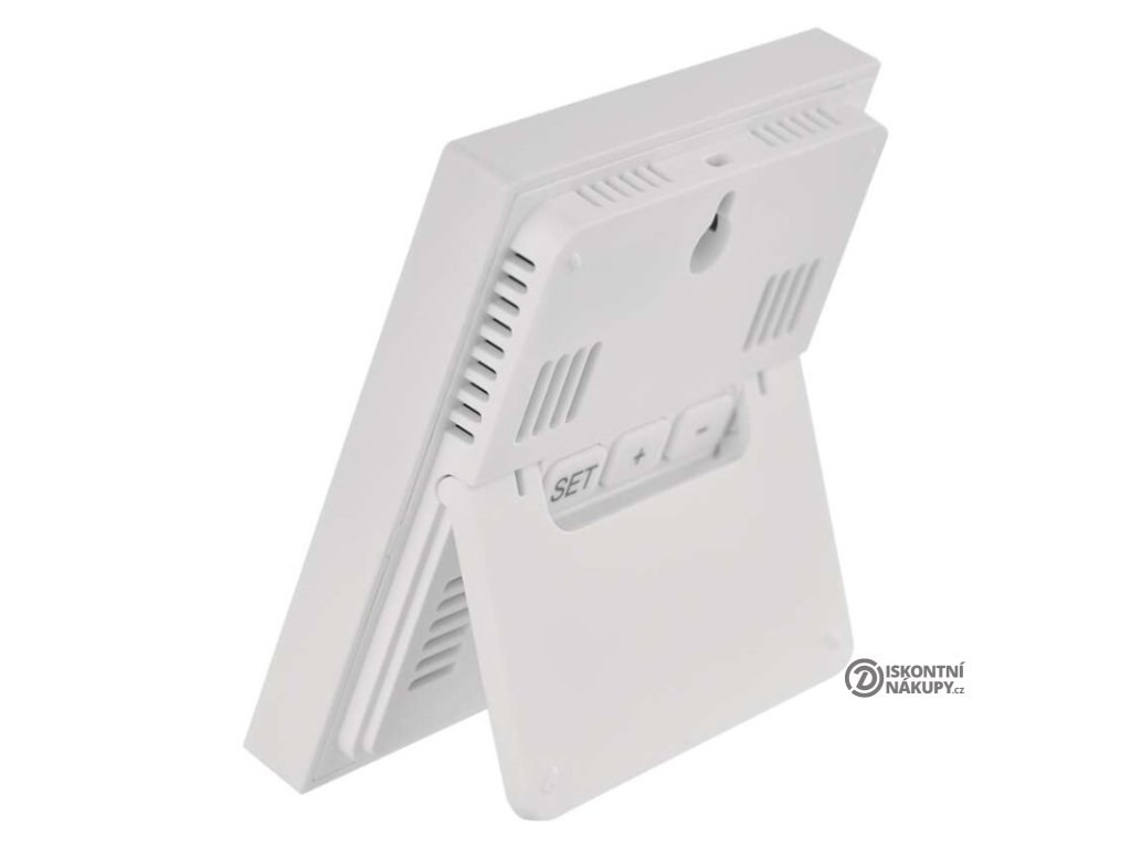 Teploměr v bílé barvě s hodinami řízenými Quarz krystalem. Zobrazuje vnitřní teplotu a vlhkost, hodiny, datum.
