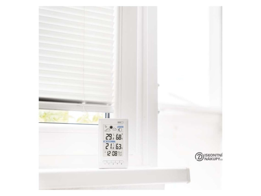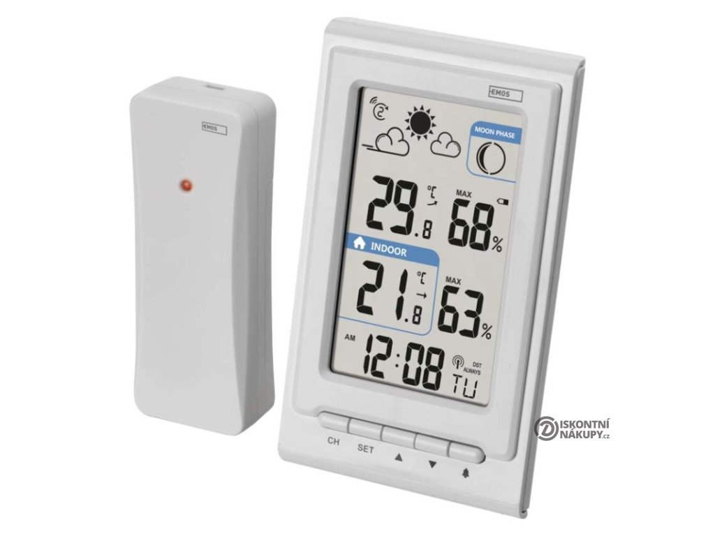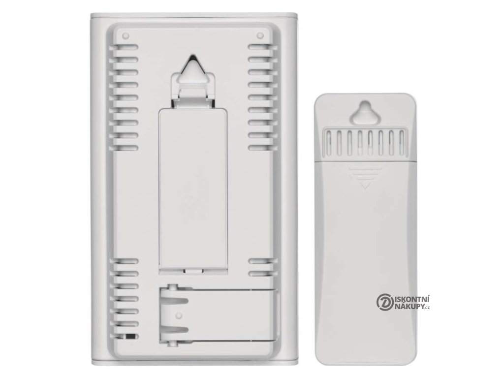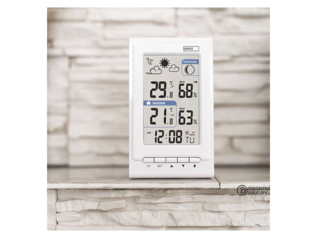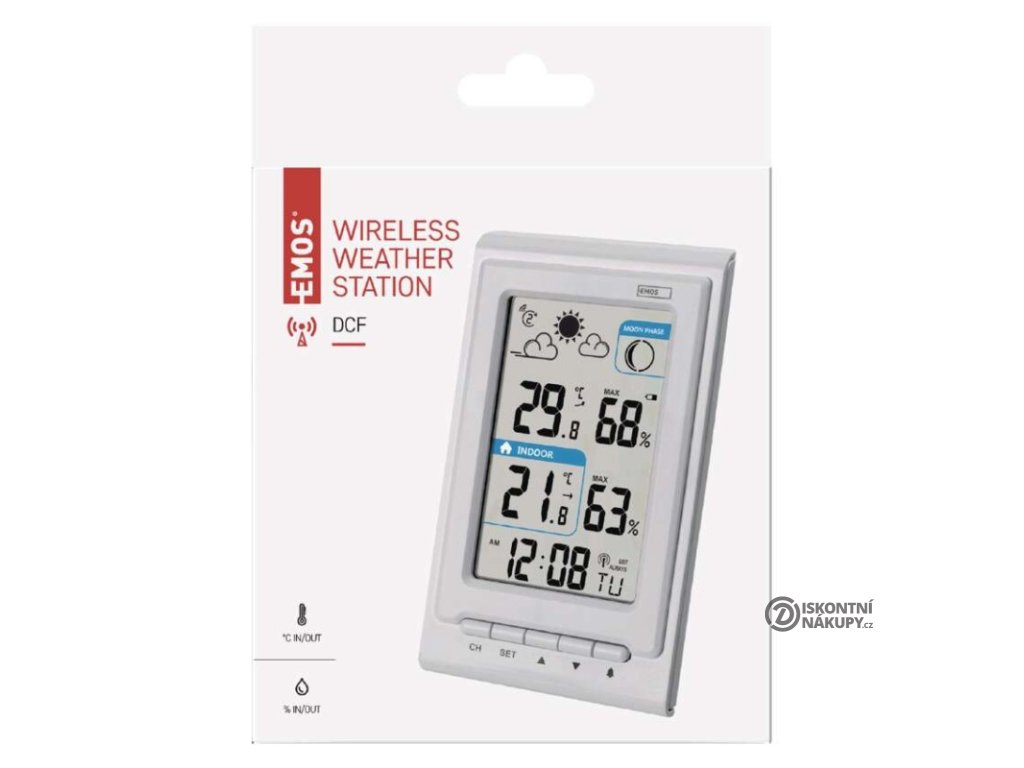 12/24 formát času: ano|anemometr: ne|barevný displej (black mask) podsvícený: ne|barometr: ne|budík: ano|časová pásma: ano|další funkce: –|datum: ano|dosah čidla: až 30 m|drátová sonda k čidlu: ne|elektronické plošné podsvícení: ne|fáze měsíce: ano|hodiny: řízené DCF signálem|kalendář: ano|kompatibilita: –|korekce nadmořské výšky: ne|LED podsvícení displeje: ne|min. a max. teplota: ano|možné další čidlo: až 3 čidla (E05018, E00387)|možnost nastavení jednotky teploty: °C/°F|možnost pověšení na zeď: ano|napájení čidla: 2× 1,5 V AA (nejsou součástí balení)|napájení stanice: 2× 1,5 V AAA (nejsou součástí balení)|notifikace do mobilní aplikace: –|opakované buzení: ano|ovládání hlasovými asistenty: –|podporované OS: –|předpověď počasí: ano|přenosová frekvence: 433 MHz|prodejní obal: 1 ks, krabička|produkt: meteostanice|projekce: ne|protokol: –|provedení: bezdrátové|rozměr čidla: 21 × 38 × 100 mm|rozměr hlavní jednotky: 23 × 76 × 126 mm|síťový adaptér: ne|srážkoměr: ne|teplotní výstraha: ne|trend teploty: ano|trend tlaku: ne|trvalé podsvícení: ne|velikost displeje: 50 × 81 mm|venkovní teplota: -40 °C až +60 °C, rozlišení 0,1 °C|venkovní vlhkost: 20 % až 95 % RV, rozlišení 1 %|vnitřní teplota: -10 °C až +50 °C, rozlišení 0,1 °C|vnitřní vlhkost: 1 % až 99 % RV, rozlišení 1 %Popis produktu
