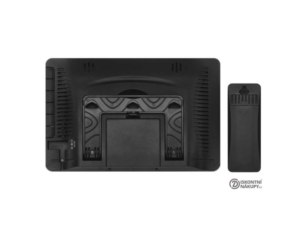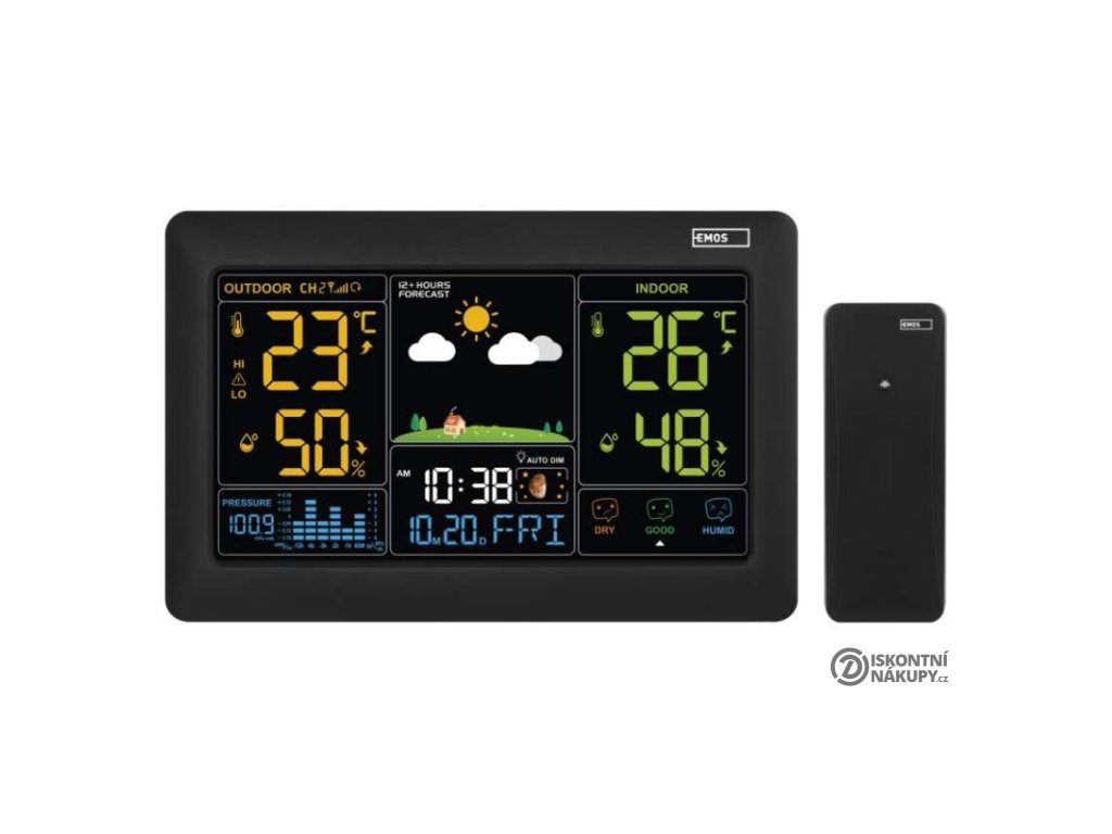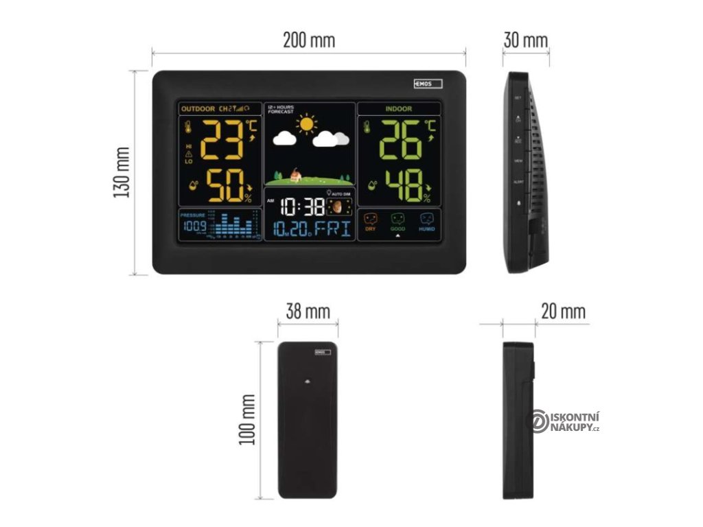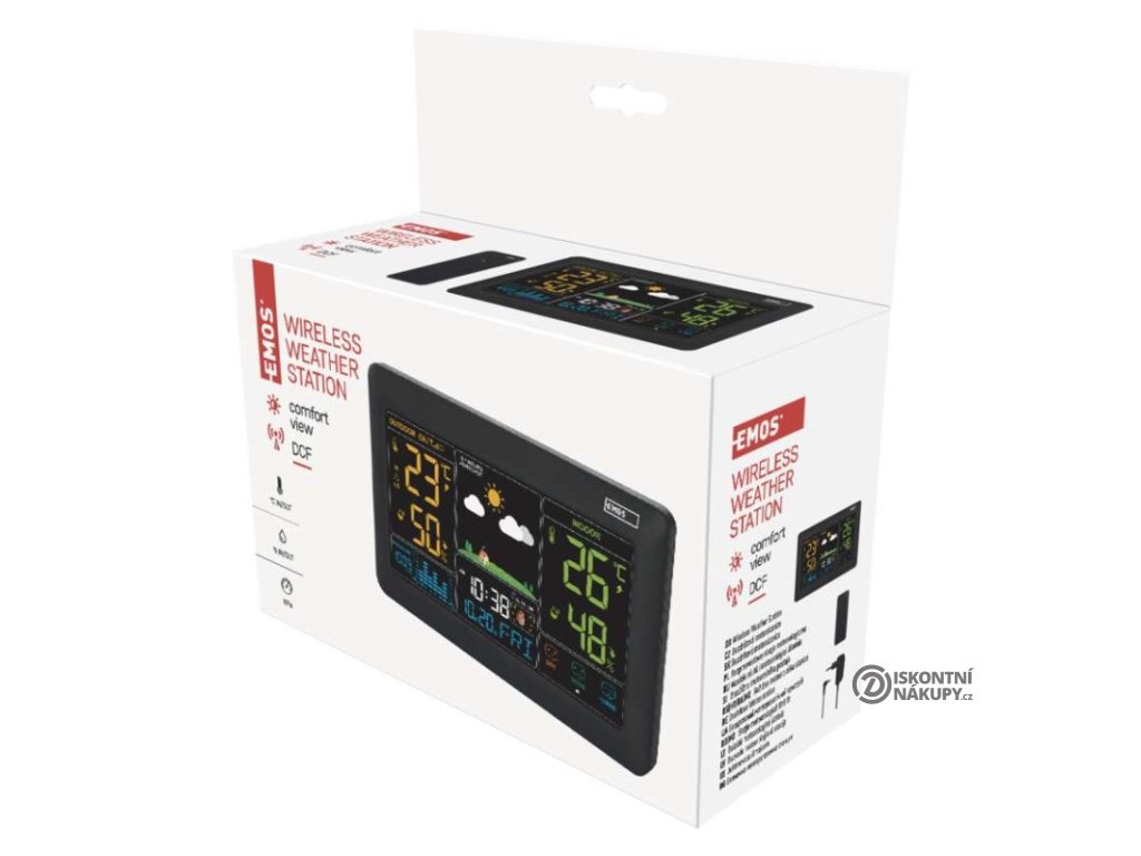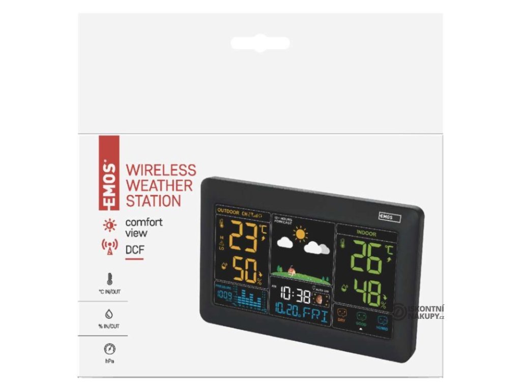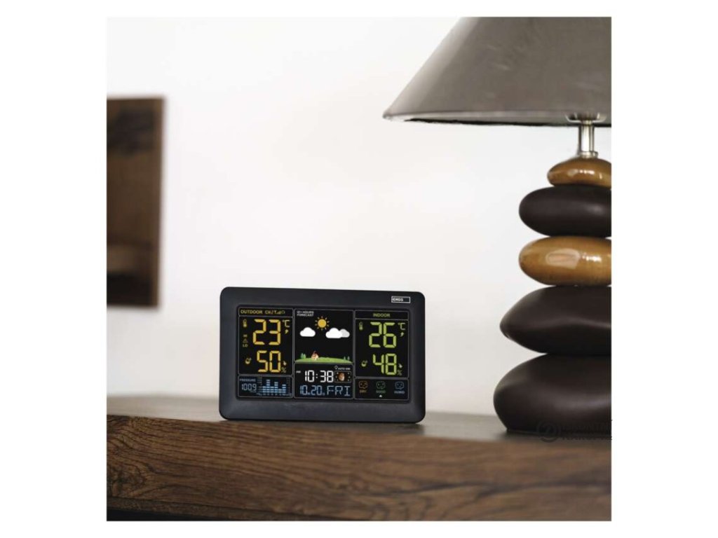 12/24 formát času: ano|anemometr: ne|barevný displej (black mask) podsvícený: ano|barometr: ano|budík: ano|časová pásma: ano|datum: ano|dosah čidla: až 80 m|drátová sonda k čidlu: ne|elektronické plošné podsvícení: ano|fáze měsíce: ano|hodiny: řízené DCF signálem|kalendář: ano|korekce nadmořské výšky: ne|LED podsvícení displeje: ano|min. a max. teplota: ano|možné další čidlo: až 3 čidla (E00387)|možnost nastavení jednotky teploty: °C/°F|možnost pověšení na zeď: ano|napájení čidla: 2× 1,5 V AA (nejsou součástí balení)|napájení stanice: 3× 1,5 V AA (nejsou součástí balení)|opakované buzení: ano|předpověď počasí: ano|přenosová frekvence: 433 MHz|prodejní obal: 1 ks, krabička|produkt: meteostanice|projekce: ne|provedení: bezdrátové|rozměr čidla: 38 × 20 × 100 mm|rozměr hlavní jednotky: 30 × 200 × 130 mm|síťový adaptér: ano, 5 V DC/1 200 mA (součástí balení)|srážkoměr: ne|teplotní výstraha: ano|trend teploty: ano|trend tlaku: ano|trvalé podsvícení: ano|velikost displeje: 168 × 91 mm|venkovní teplota: -40 °C až +60 °C, rozlišení 0,1 °C|venkovní vlhkost: 1 % až 99 % RV, rozlišení 1 %|vnitřní teplota: -10 °C až +50 °C, rozlišení 0,1 °C|vnitřní vlhkost: 1 % až 99 % RV, rozlišení 1 %Popis produktu